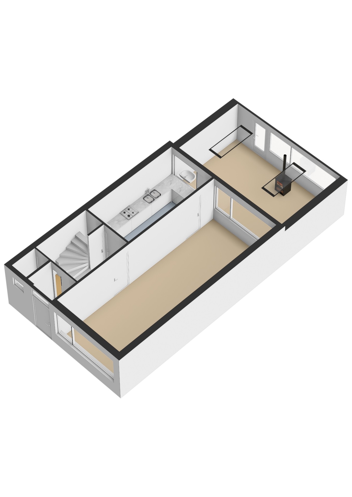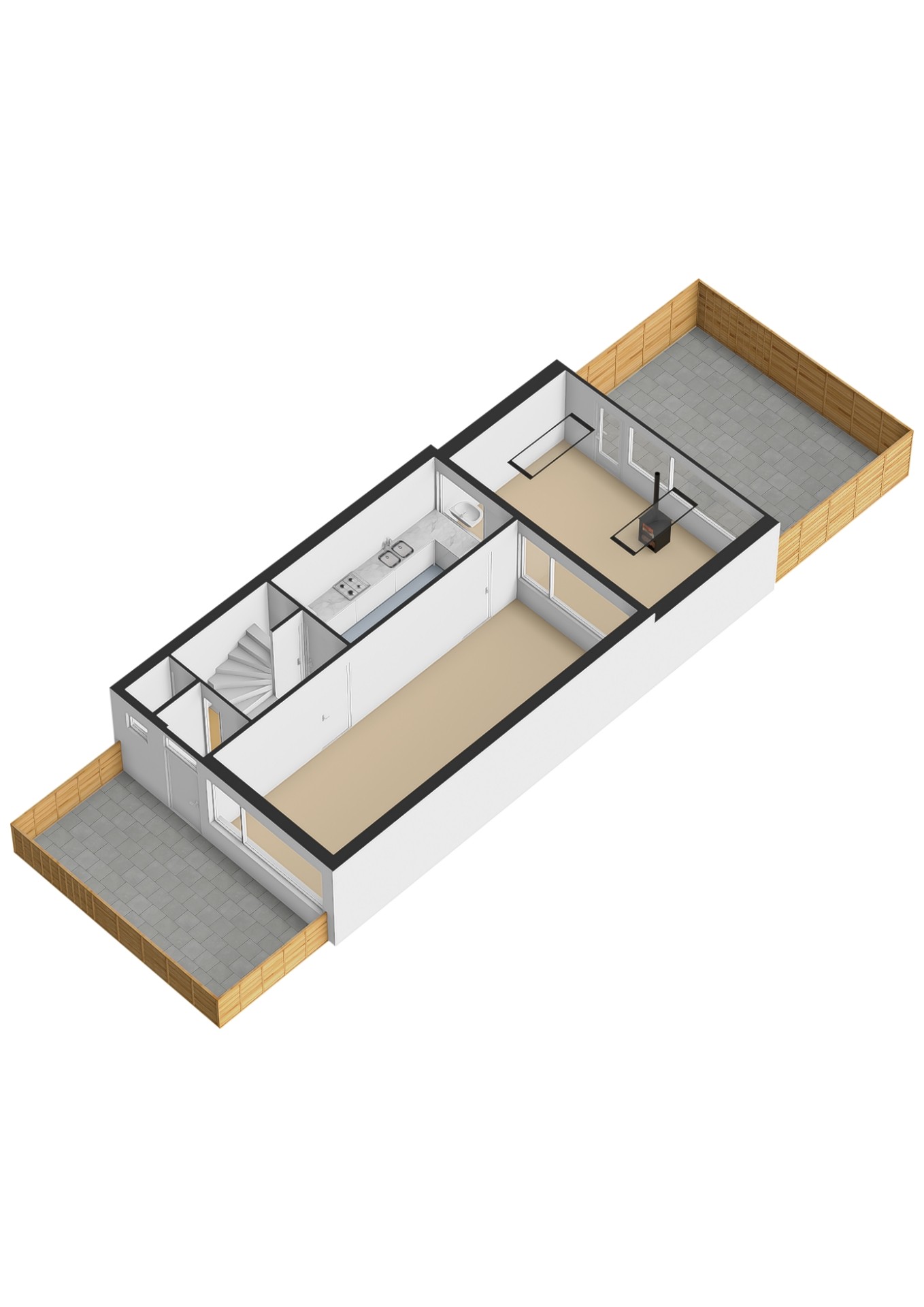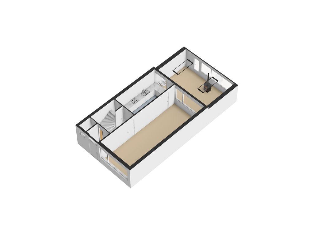 De doorlopende plavuizenvloer en grote raampartijen zorgen voor een lichte, open leefruimte. Aan de achterzijde vind je de verwarmde serre van bijna vier meter diep: een ideale tuinkamer, speelruimte of hobbyruimte, die direct aansluit op de zonnige en ruime achtertuin. De houtkachel geeft extra sfeer en warmte in de wintermaanden.