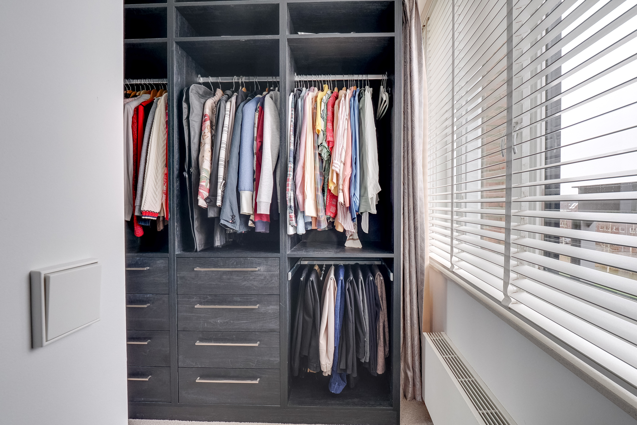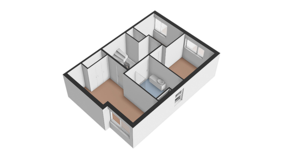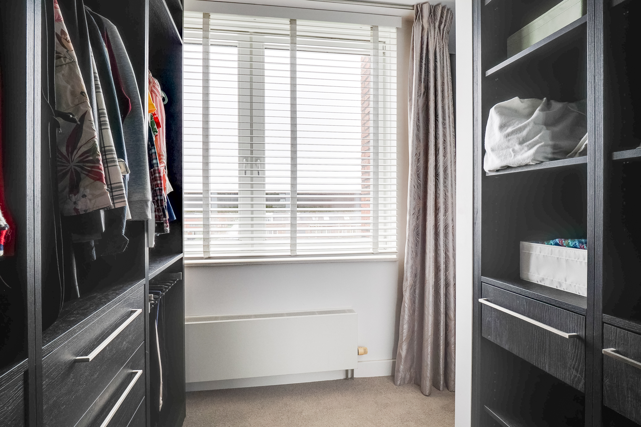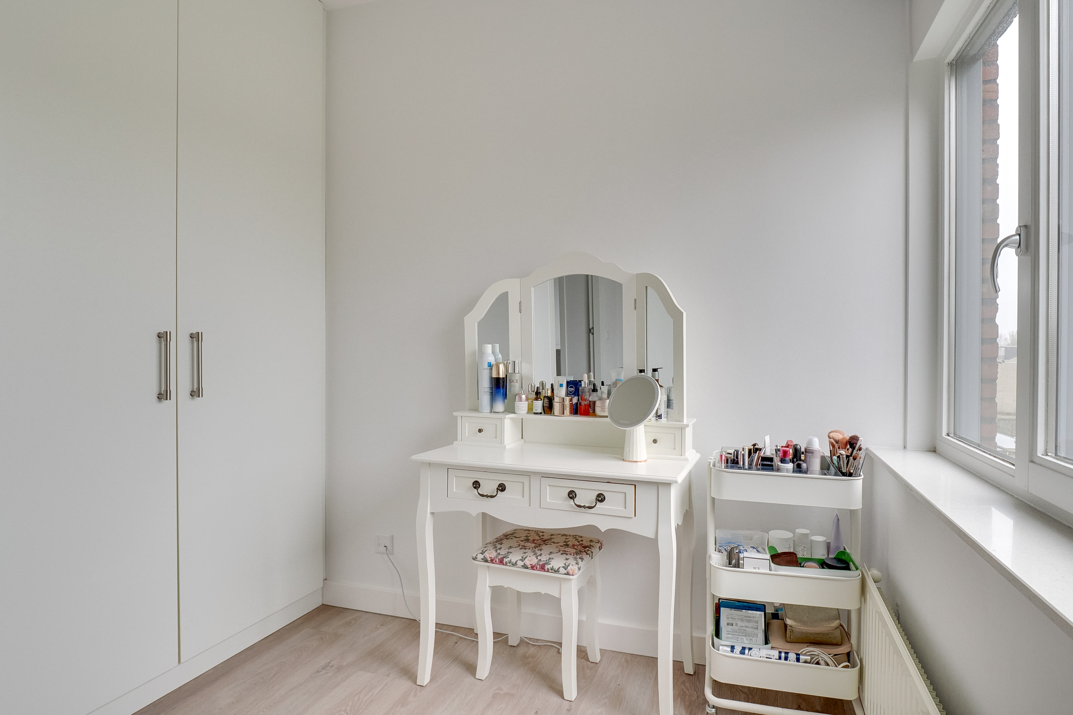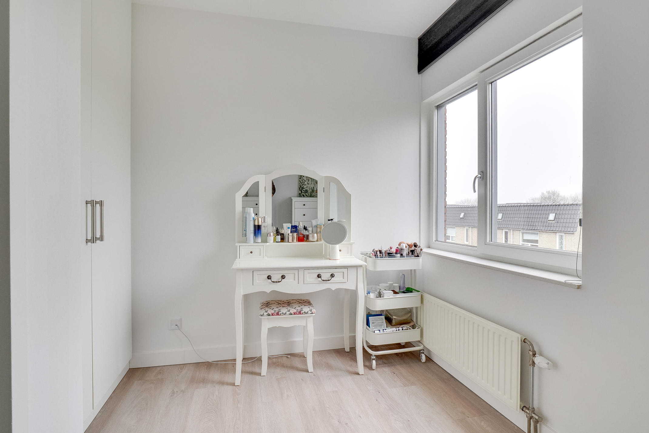 De bovenste verdieping biedt een extra ruime slaapkamer met inloopkast. Deze verdieping is uitermate geschikt als comfortabele hoofdslaapkamer of als rustige werkruimte of hobbykamer.