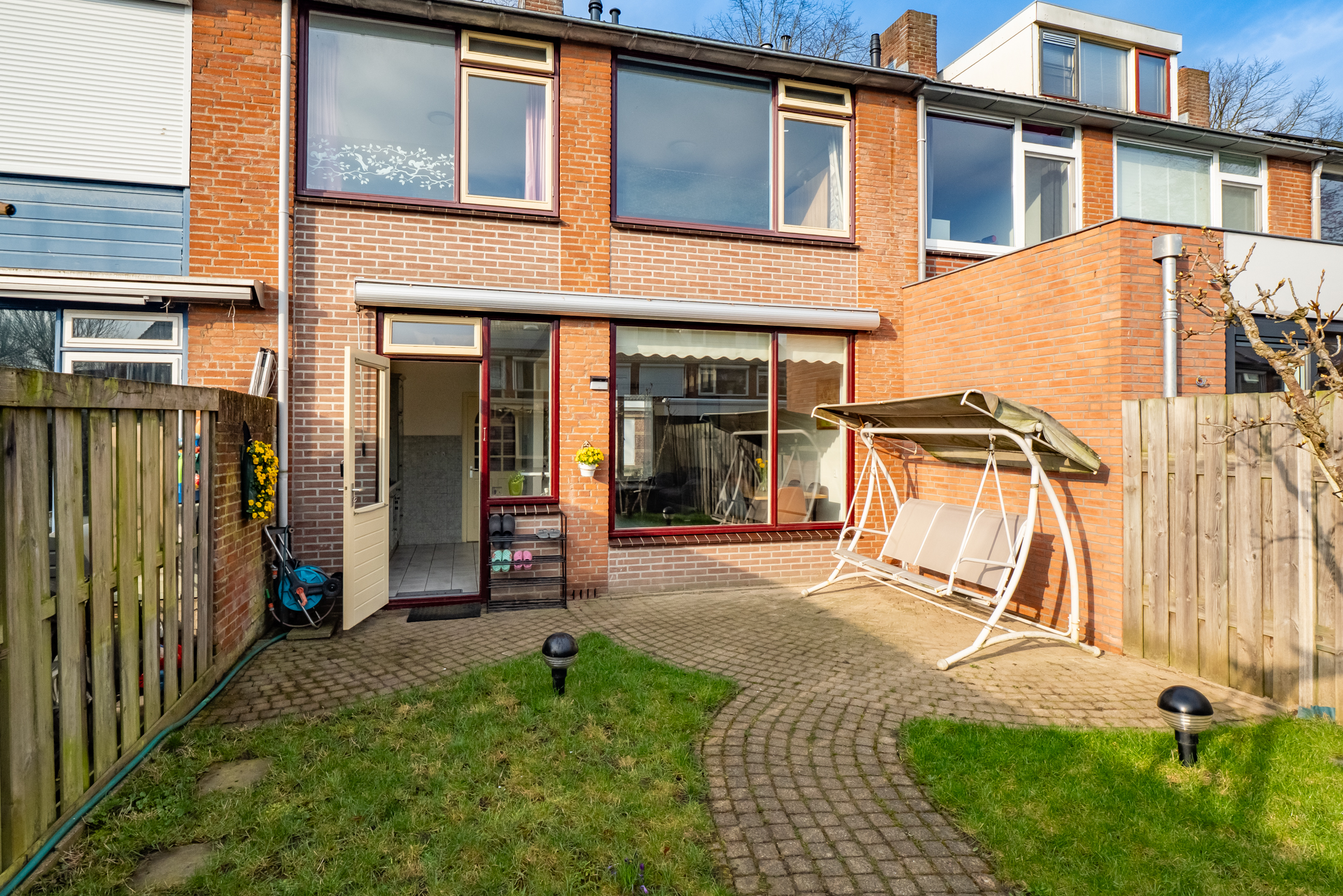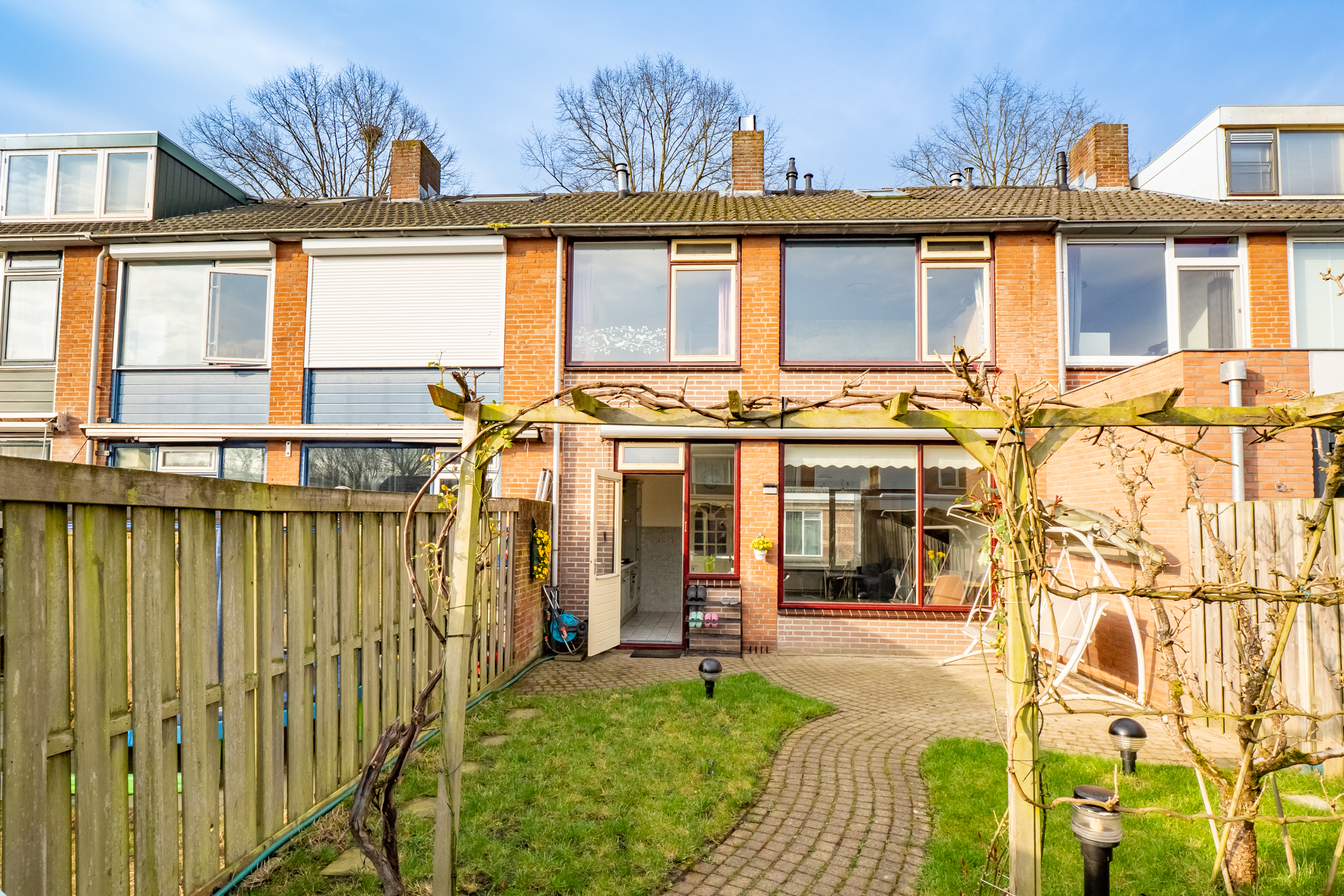 De groene achtertuin is een heerlijke plek om te ontspannen, met een gazon en diverse beplanting waaronder druiven (rood en wit) en een perenboom. Dankzij de buitenkranen aan zowel de voor- als achterzijde is het onderhoud extra praktisch. Daarnaast zorgen de zonneschermen voor extra comfort op zonnige dagen.