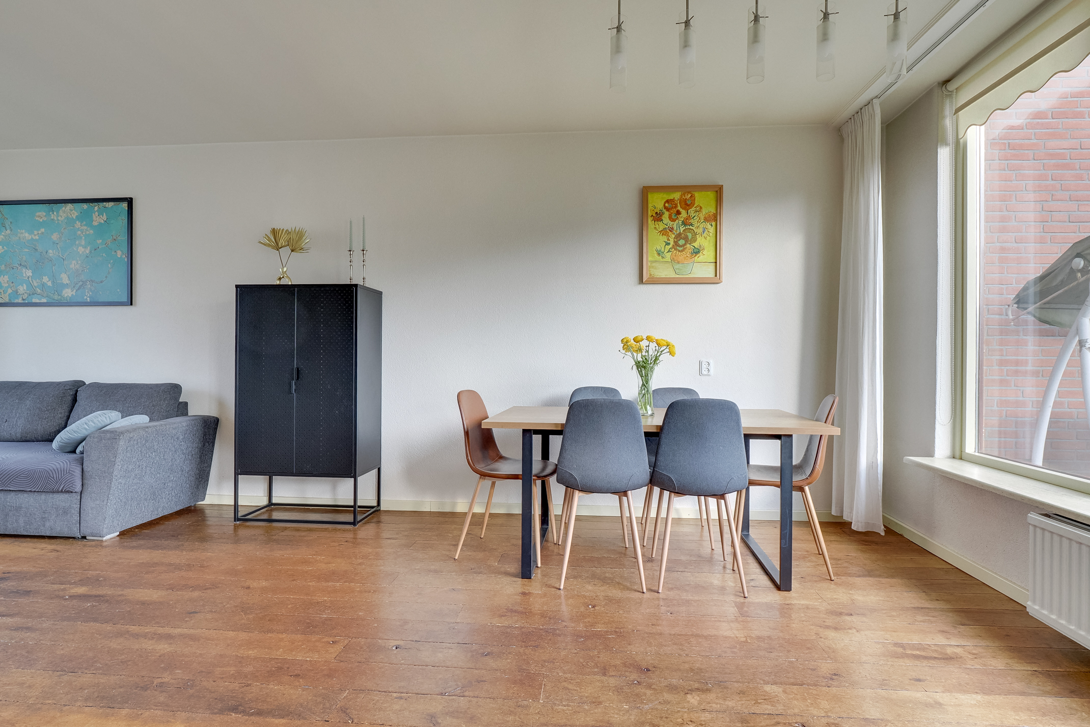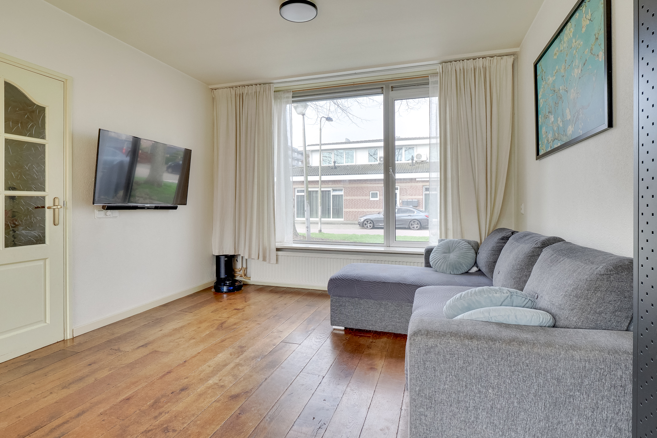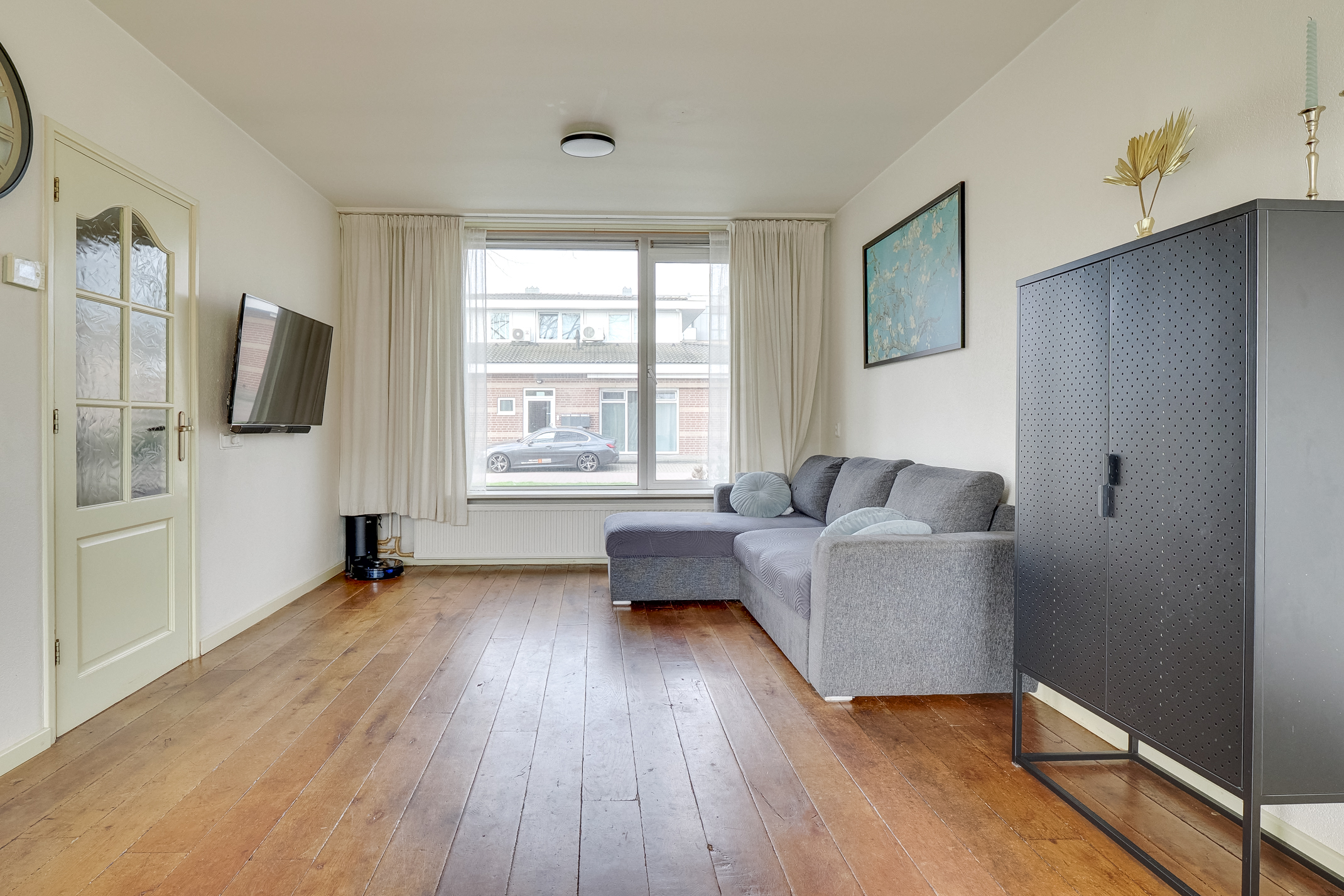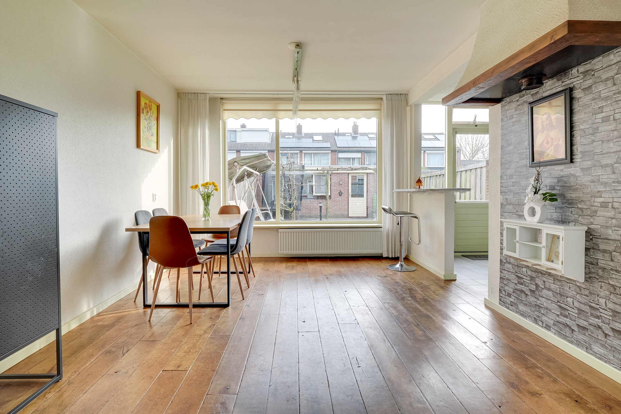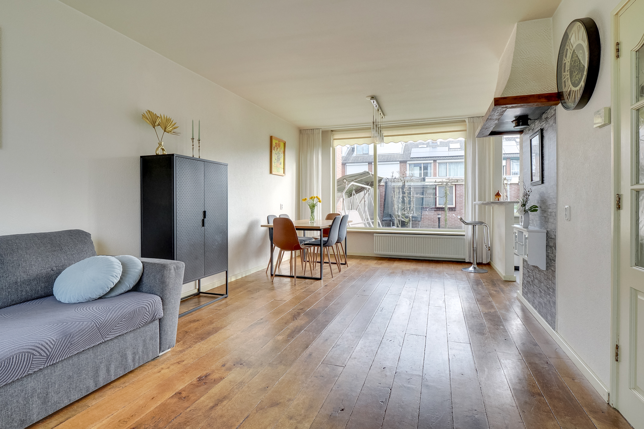 De woning beschikt over een sfeervolle woonkamer met een houten wagonplank vloer, wat direct zorgt voor een warme en verzorgde uitstraling. Dankzij de grote raampartijen is er veel lichtinval. Aan de voorzijde is de woning voorzien van een onderhoudsvriendelijke aluminium pui en aan de achterzijde van een gemetselde gevel met hardhouten kozijnen, allen voorzien van isolerend glas.