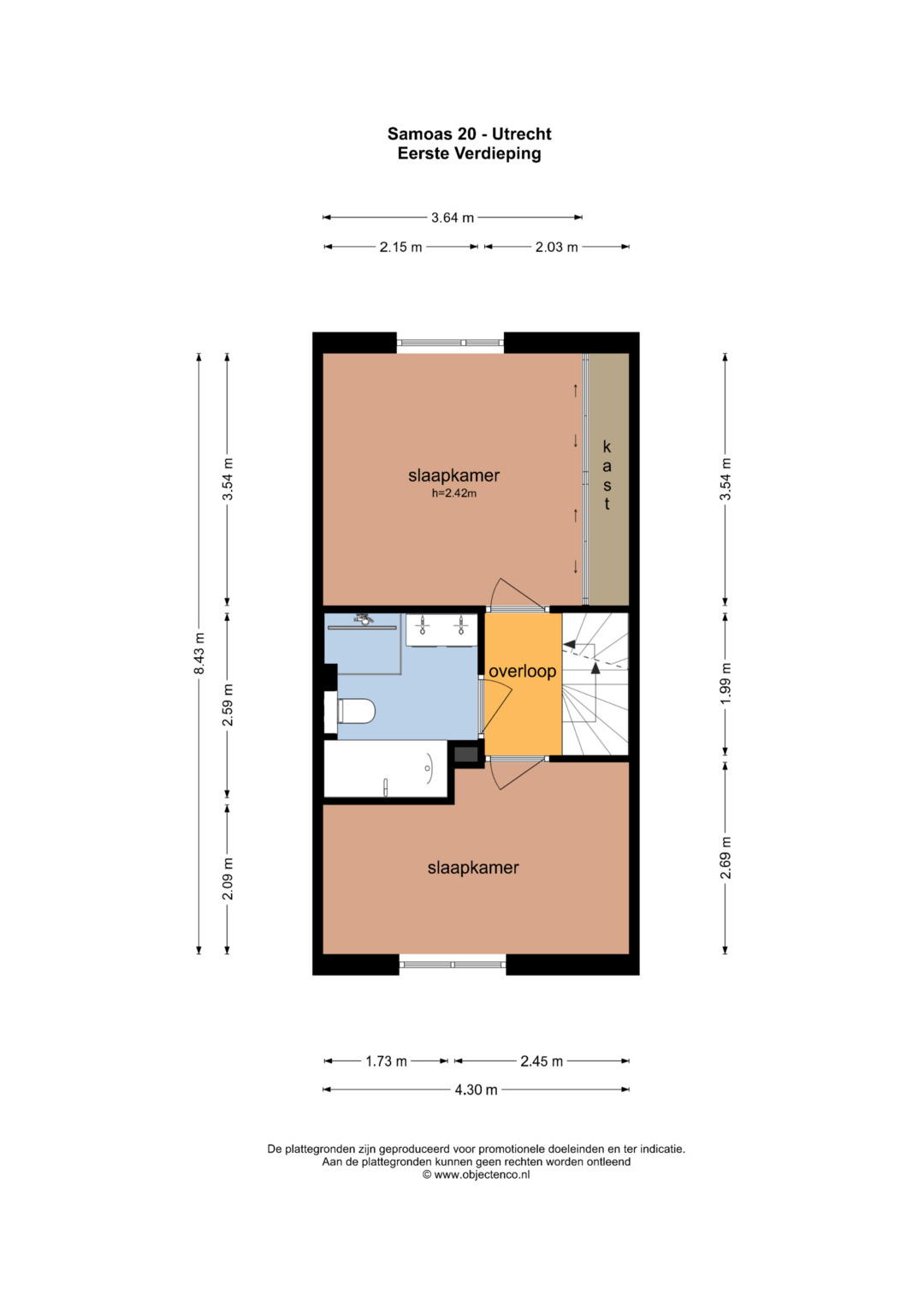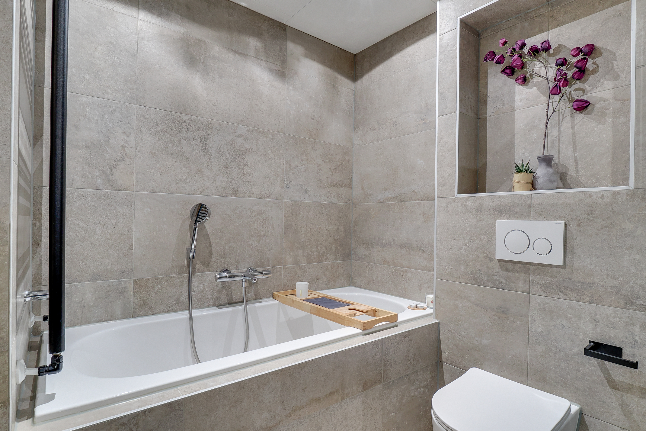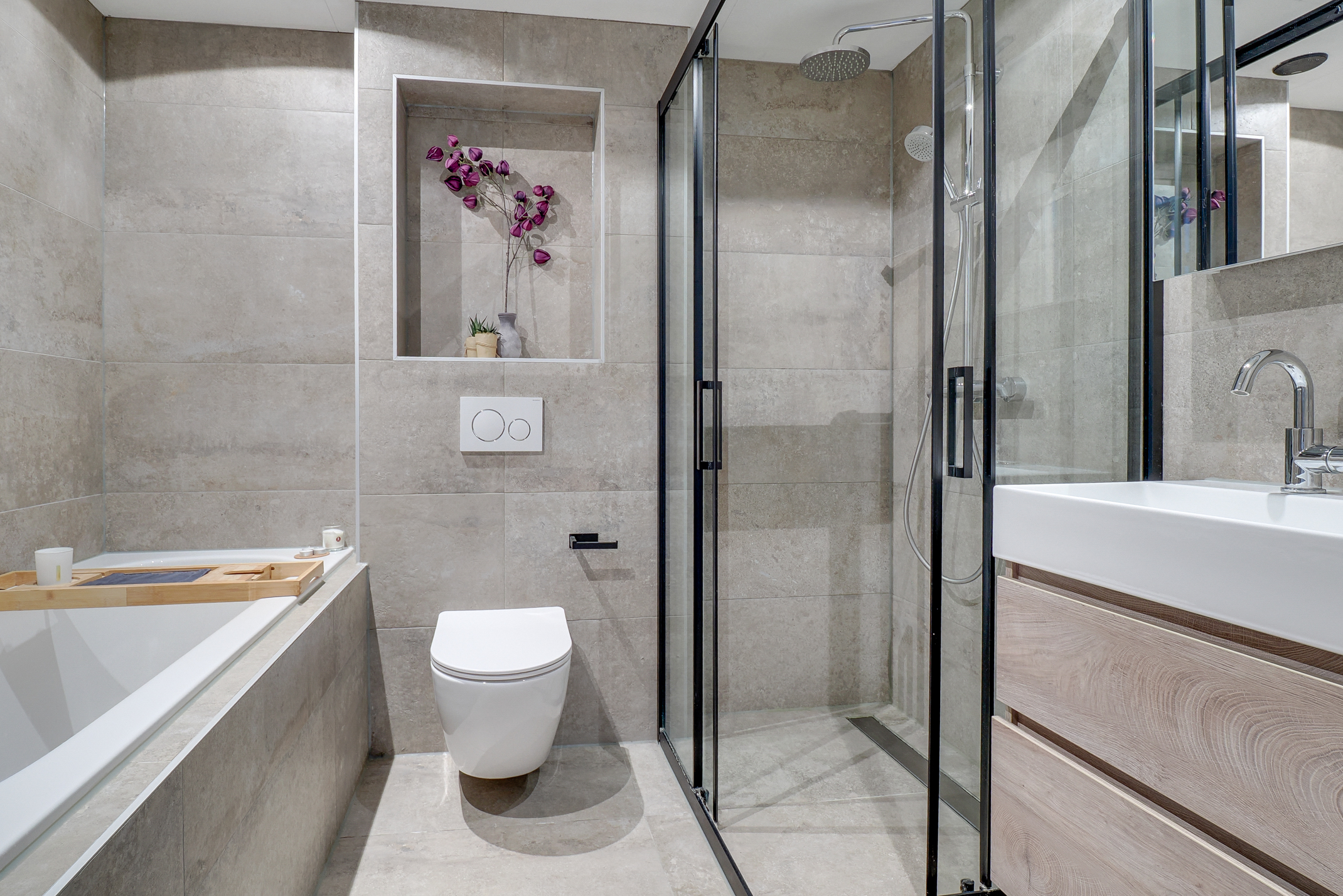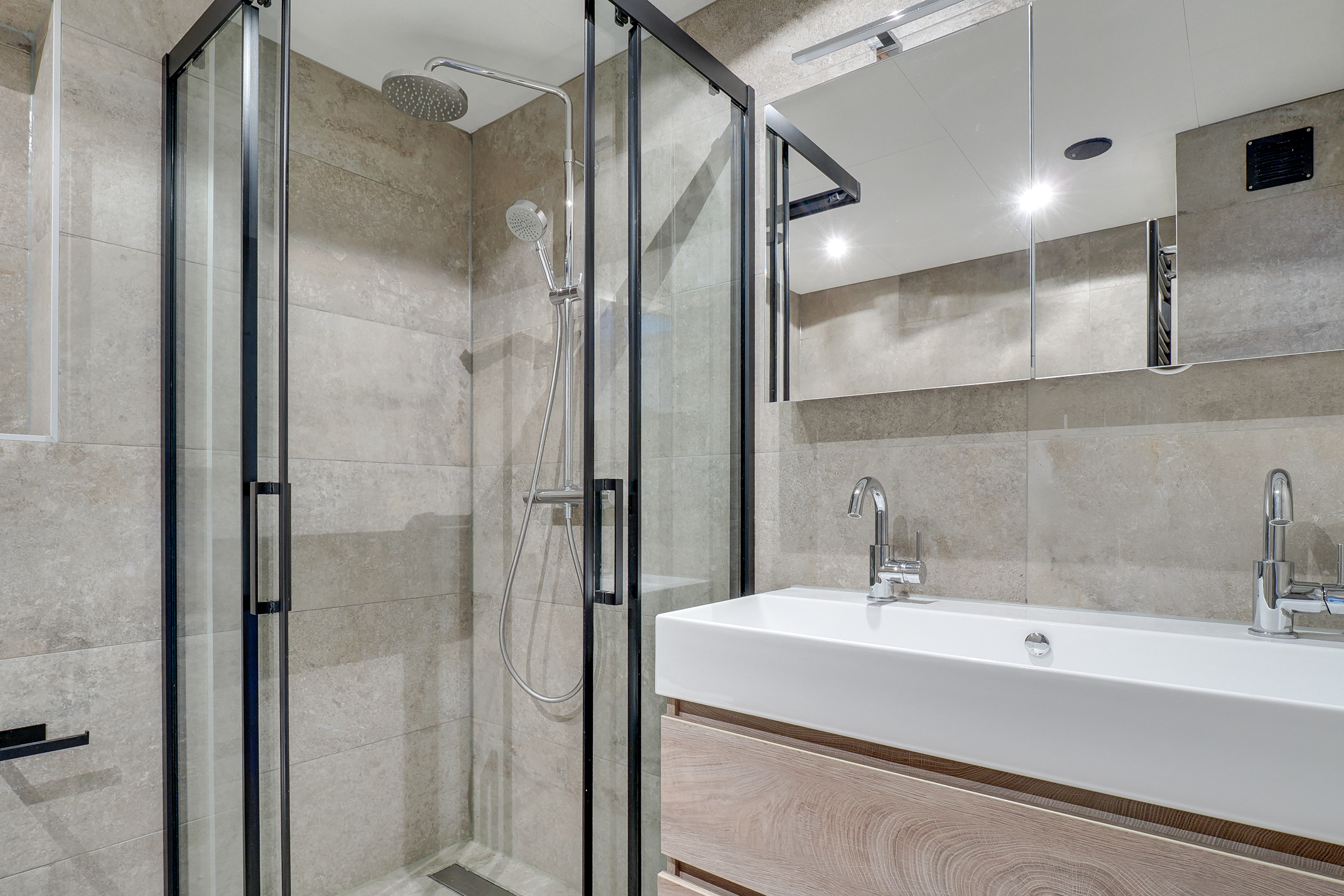 Hier bevinden zich twee slaapkamers, beide van goed formaat. De badkamer is eveneens modern en compleet uitgerust met ligbad, toilet, dubbele wastafel met meubel en een inloopdouche. Een fijne ruimte waar je heerlijk kunt ontspannen.