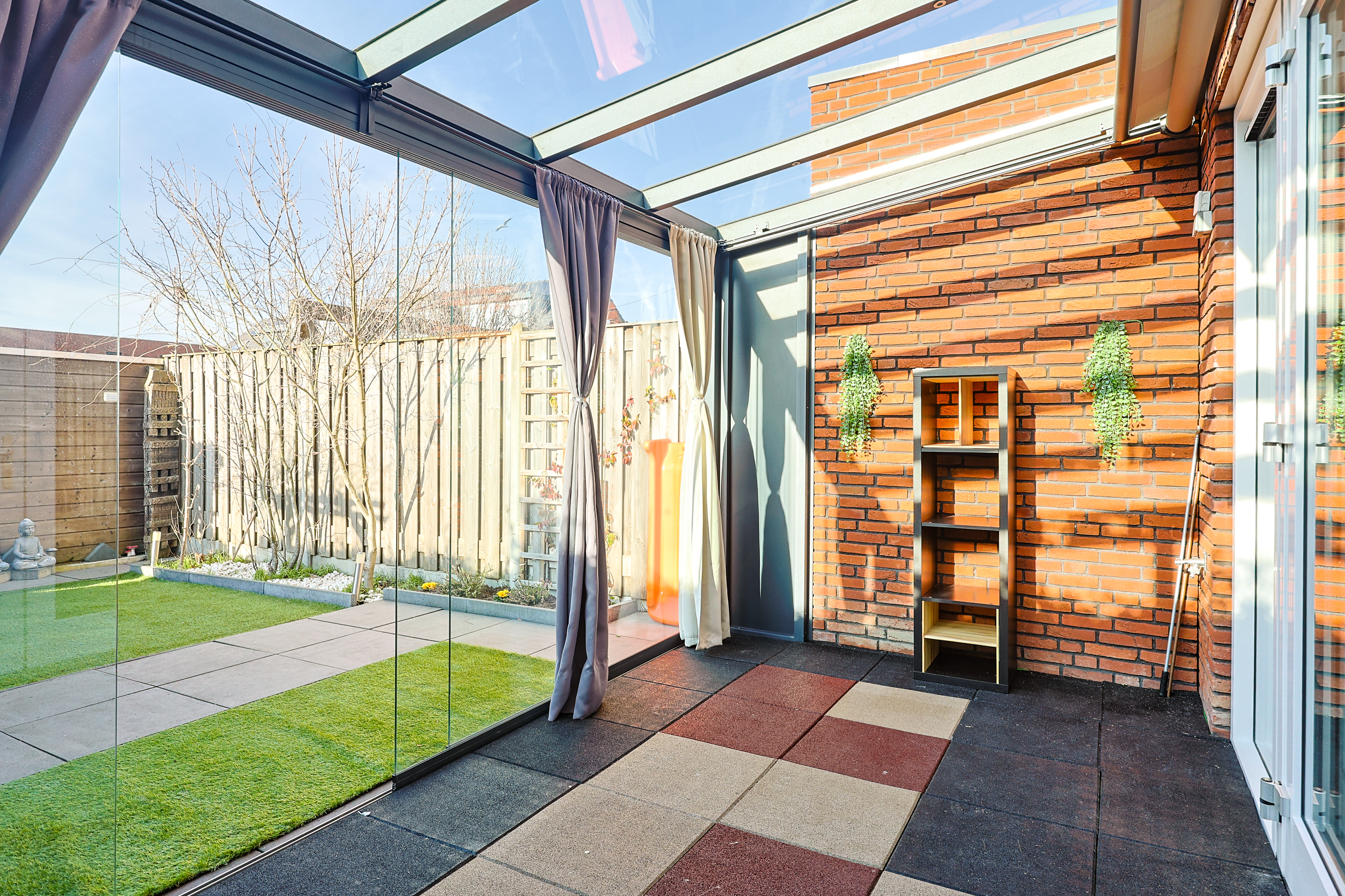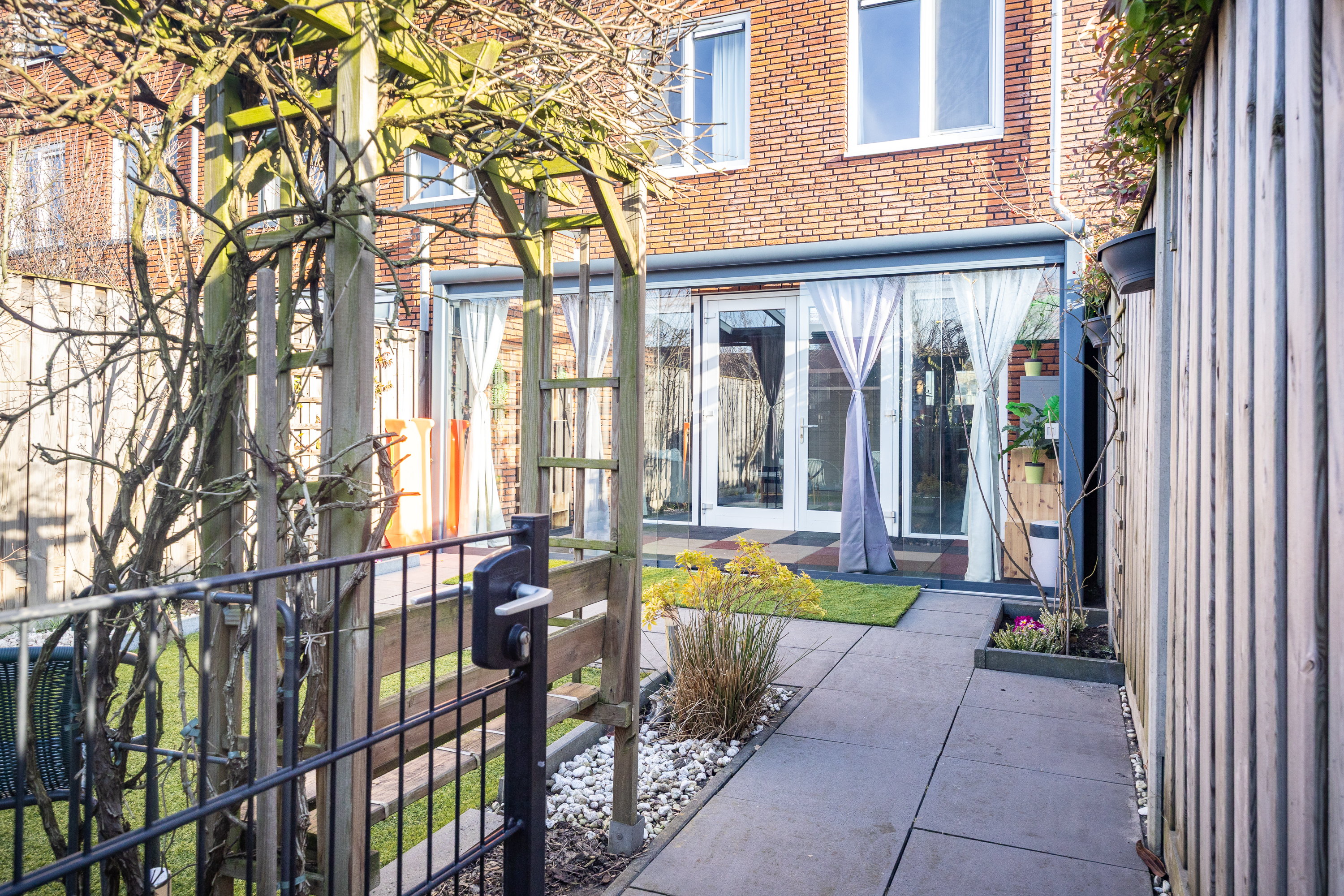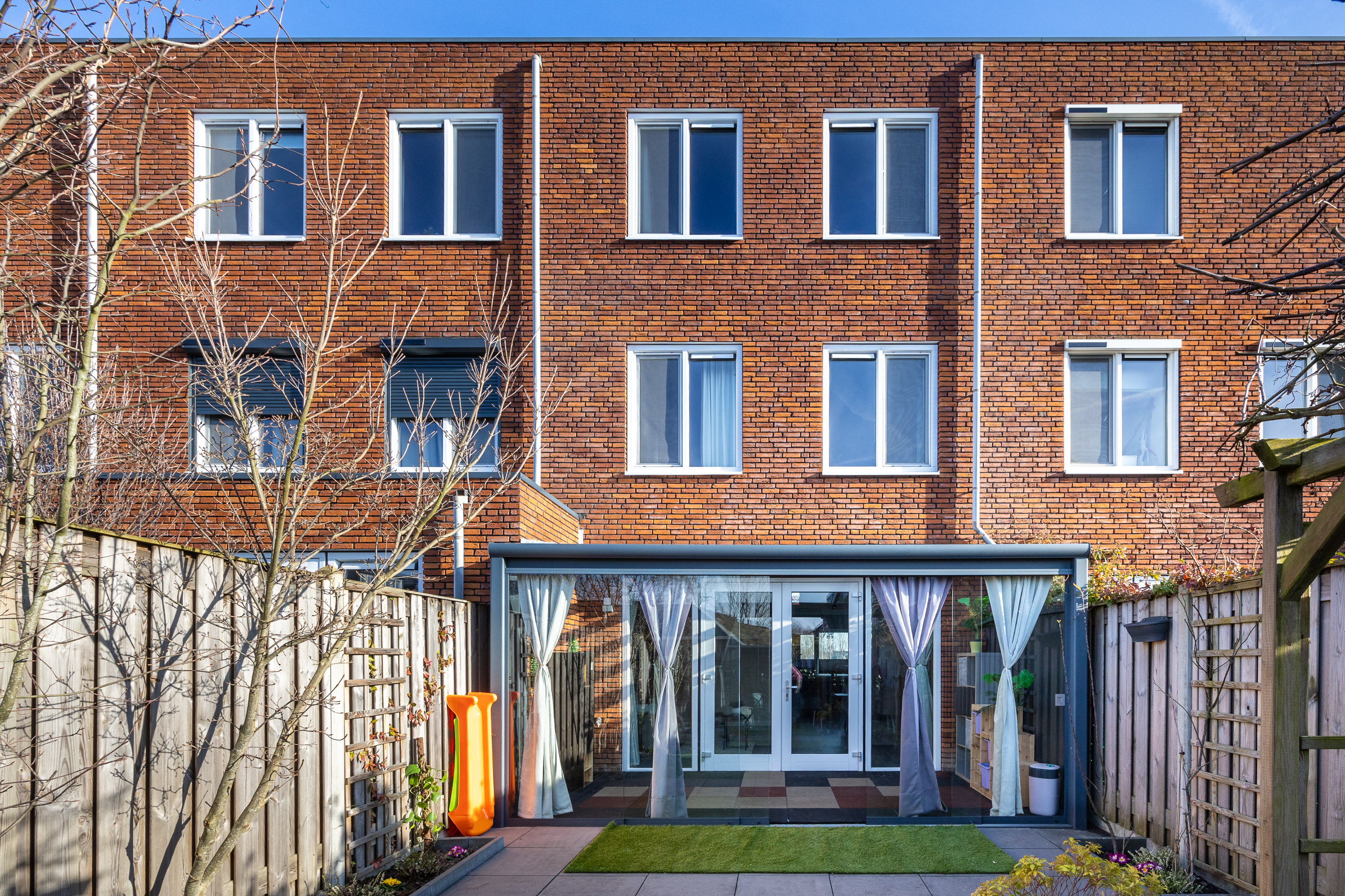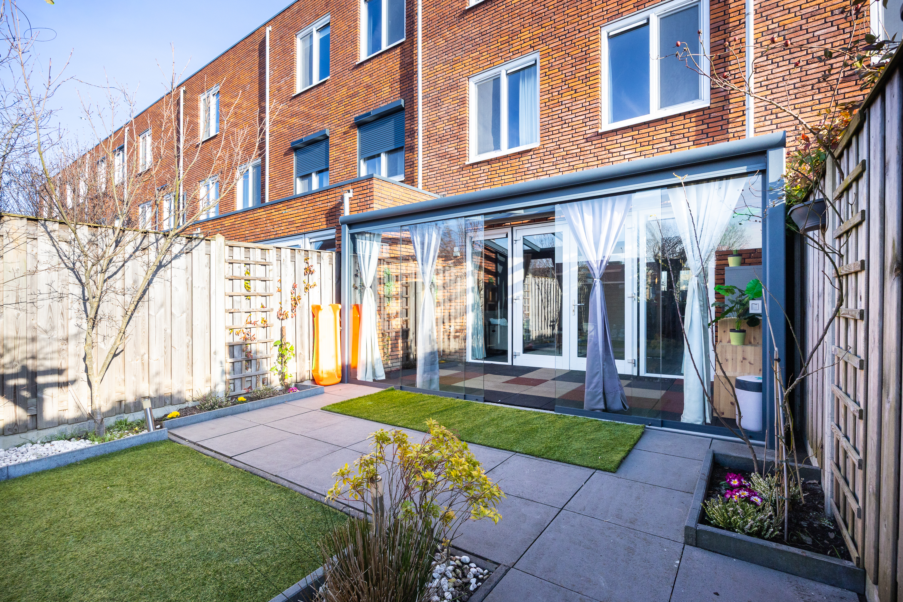 Via openslaande deuren bereik je de professioneel aangelegde serre: een volwaardige tuinkamer met geïntegreerde zonwering. De achtertuin ligt op het westen, waardoor je vanaf de middag tot in de avond van de zon geniet. Doordat er geen directe achterbebouwing is, ervaar je hier extra privacy en vrij uitzicht. Achterin de tuin bevindt zich een berging en via de achterom bereik je het parkeerterrein.