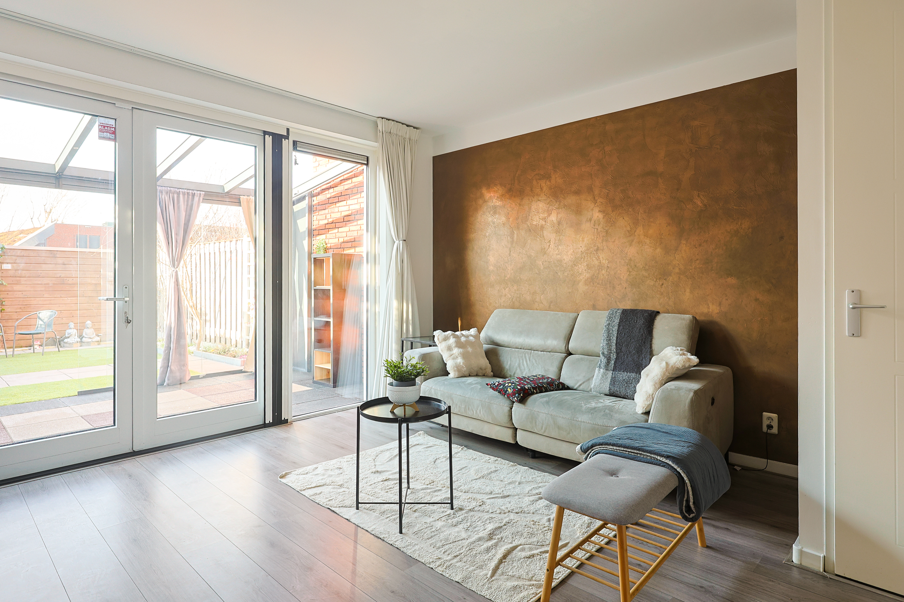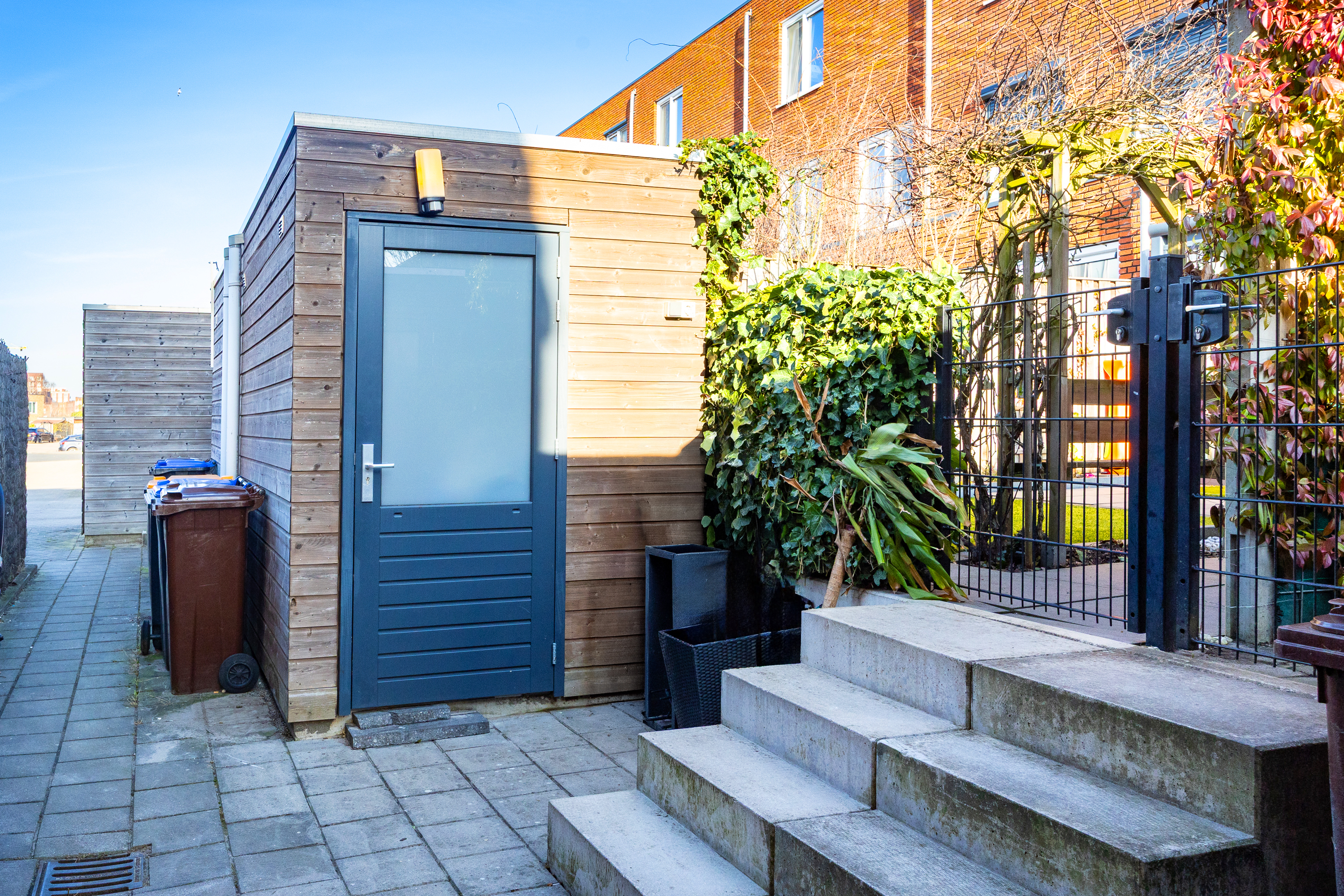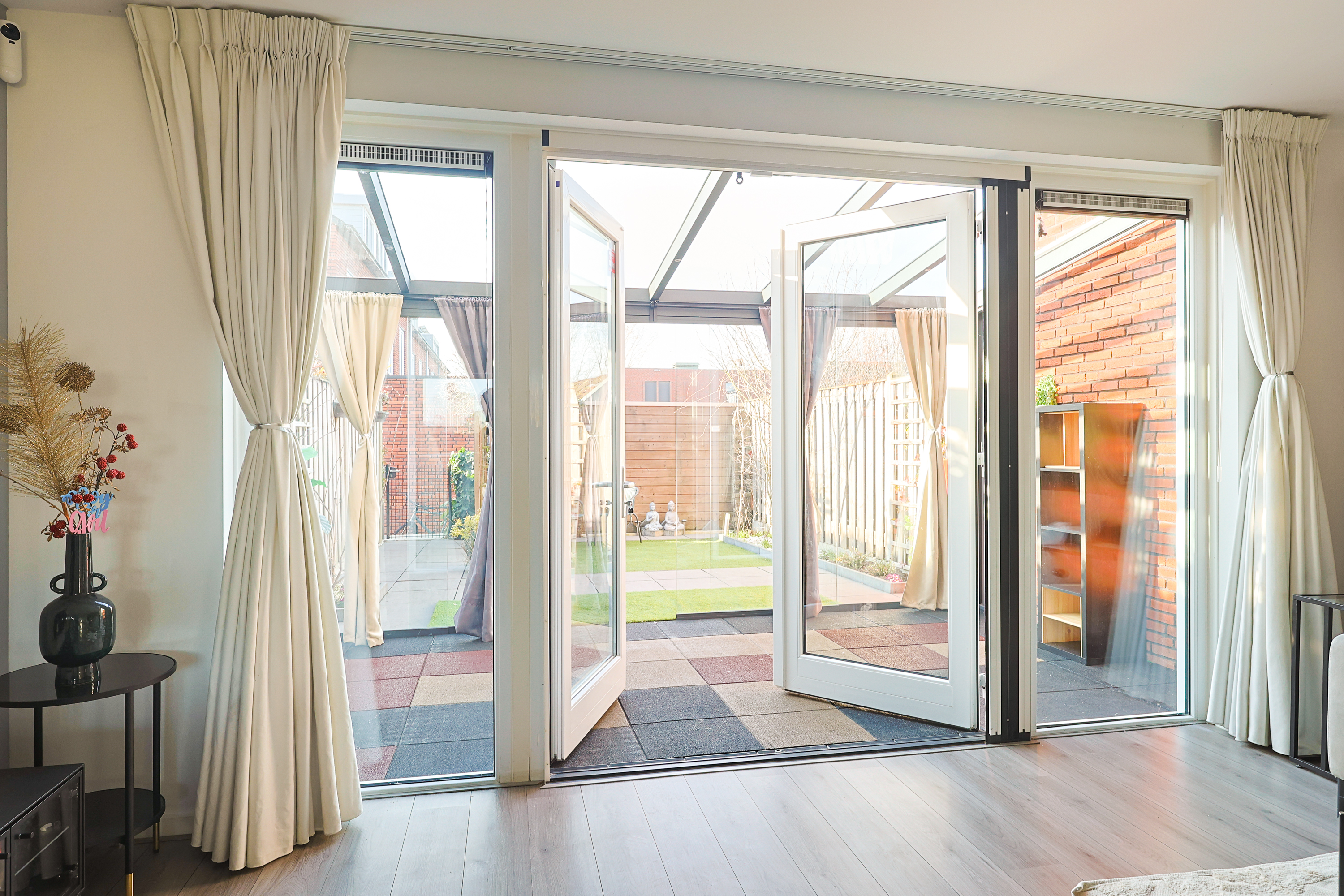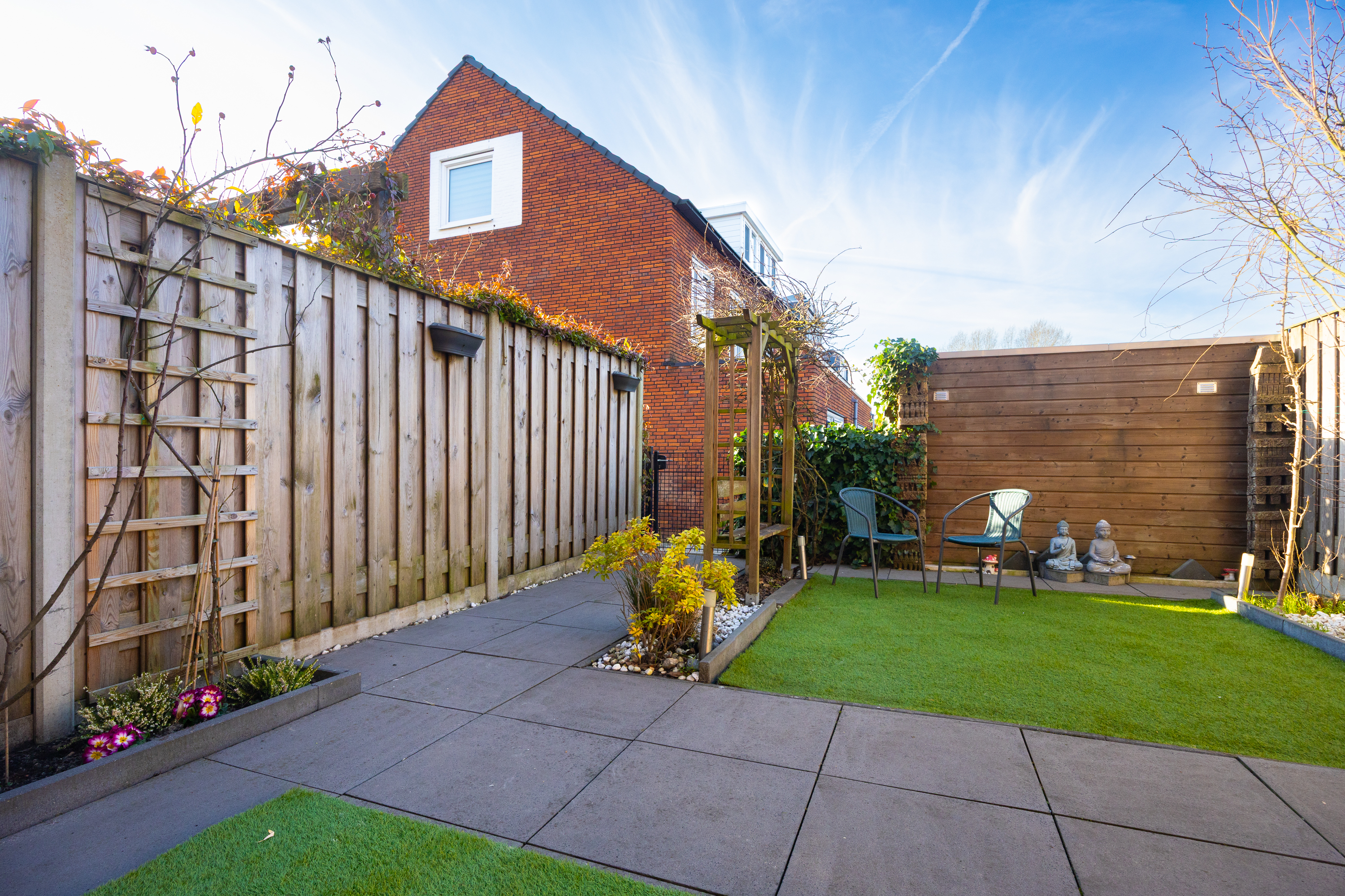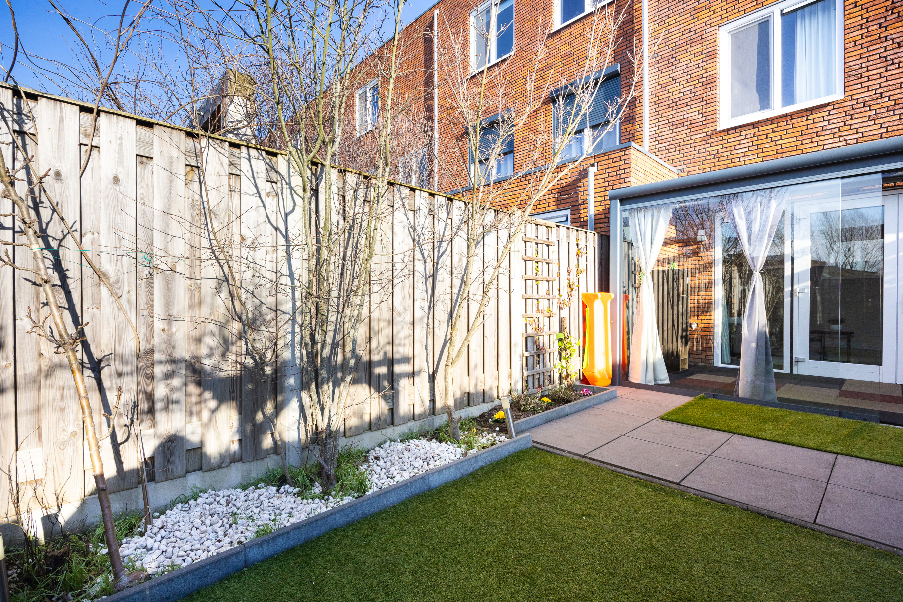 Via openslaande deuren bereik je de professioneel aangelegde serre: een volwaardige tuinkamer met geïntegreerde zonwering. De achtertuin ligt op het westen, waardoor je vanaf de middag tot in de avond van de zon geniet. Doordat er geen directe achterbebouwing is, ervaar je hier extra privacy en vrij uitzicht. Achterin de tuin bevindt zich een berging en via de achterom bereik je het parkeerterrein.