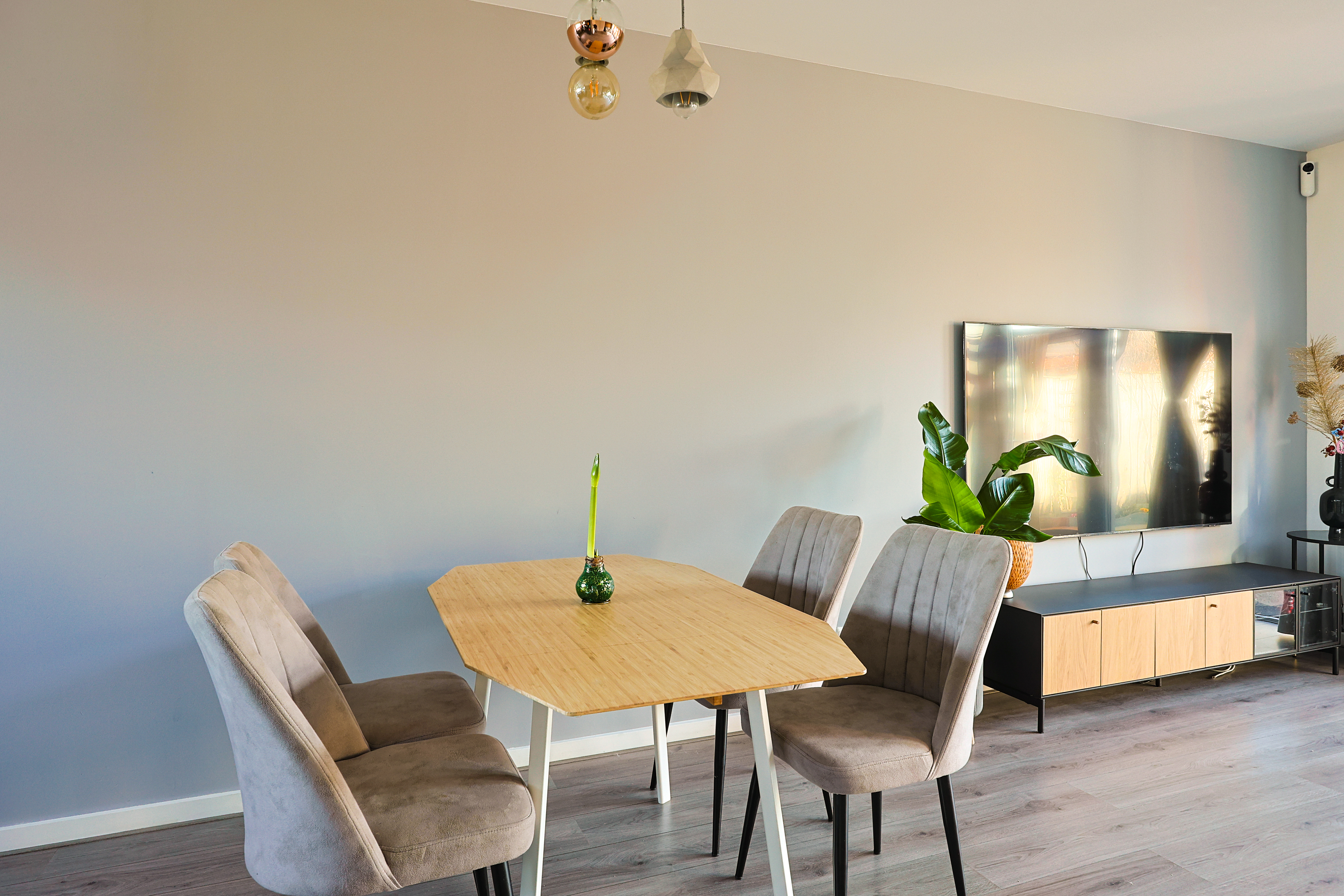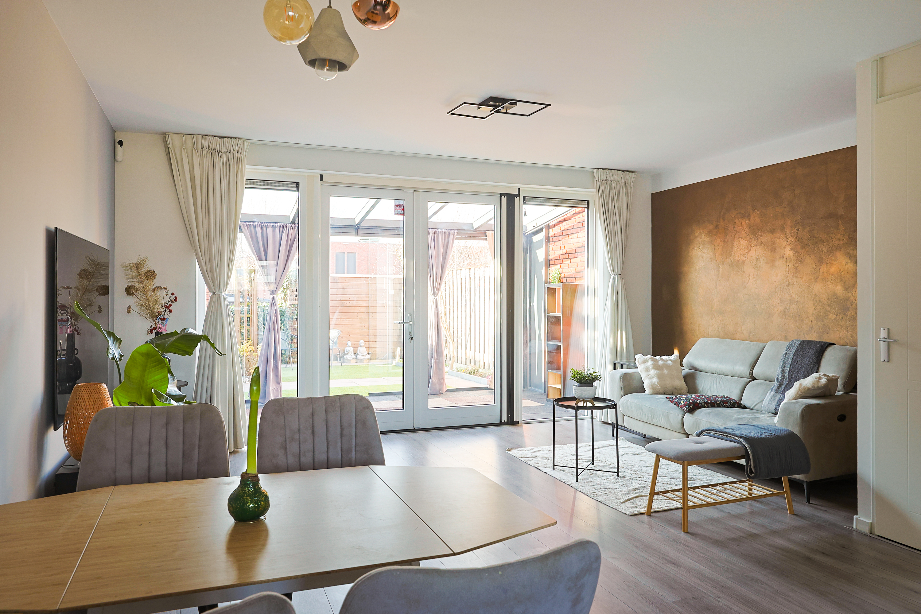 De woonkamer is ruim opgezet (meer dan 5 meter breed) en biedt volop ruimte voor een royale zit- en eethoek. De gehele begane grond is voorzien van een stijlvolle beton ciré vloer met vloerverwarming.