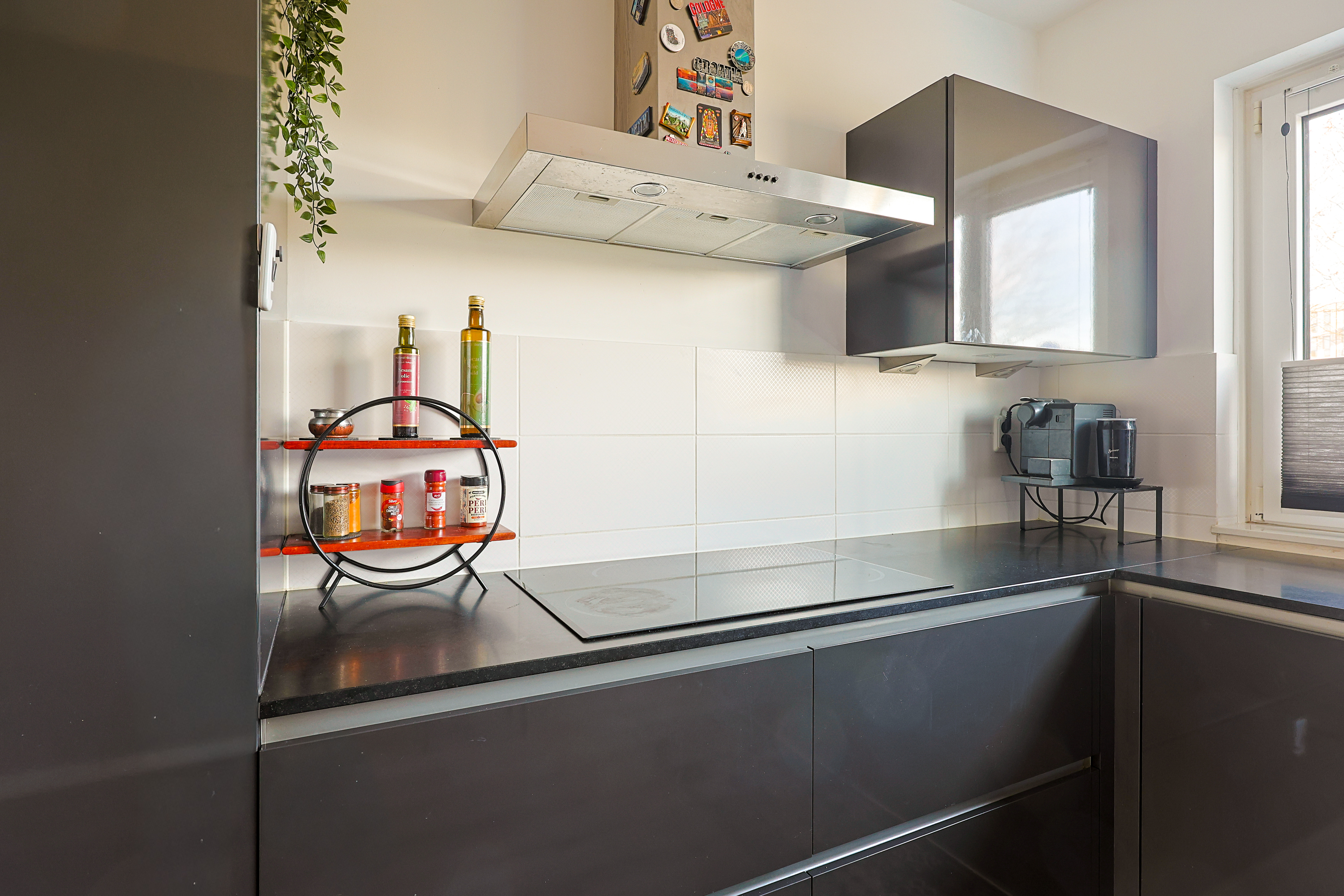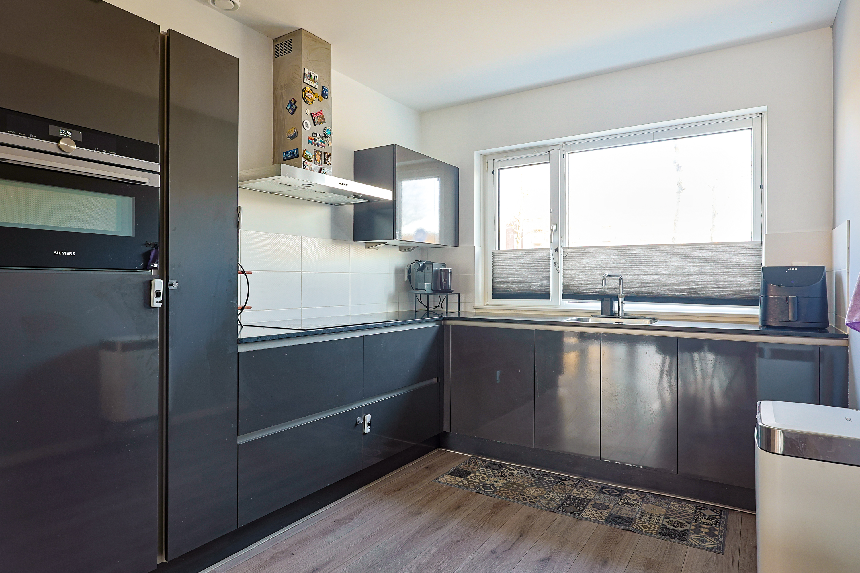De open keuken aan de voorzijde is modern uitgevoerd en voorzien van diverse inbouwapparatuur en veel werkruimte. De oven is twee jaar geleden vervangen door een Samsung Smart Oven, wat zorgt voor extra gebruiksgemak en moderne functionaliteiten. Dankzij het grote raam is er prettig daglicht in de keuken.