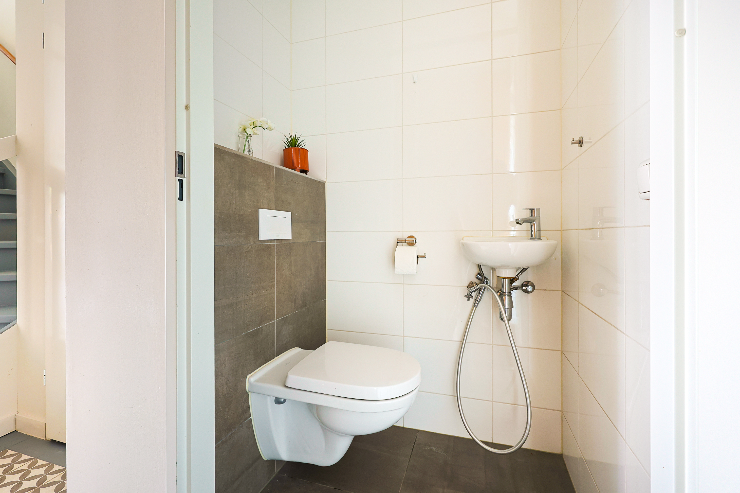 Entree, hal met meterkast, modern toilet met hangend closet en fonteintje en een praktische maatwerkkast.