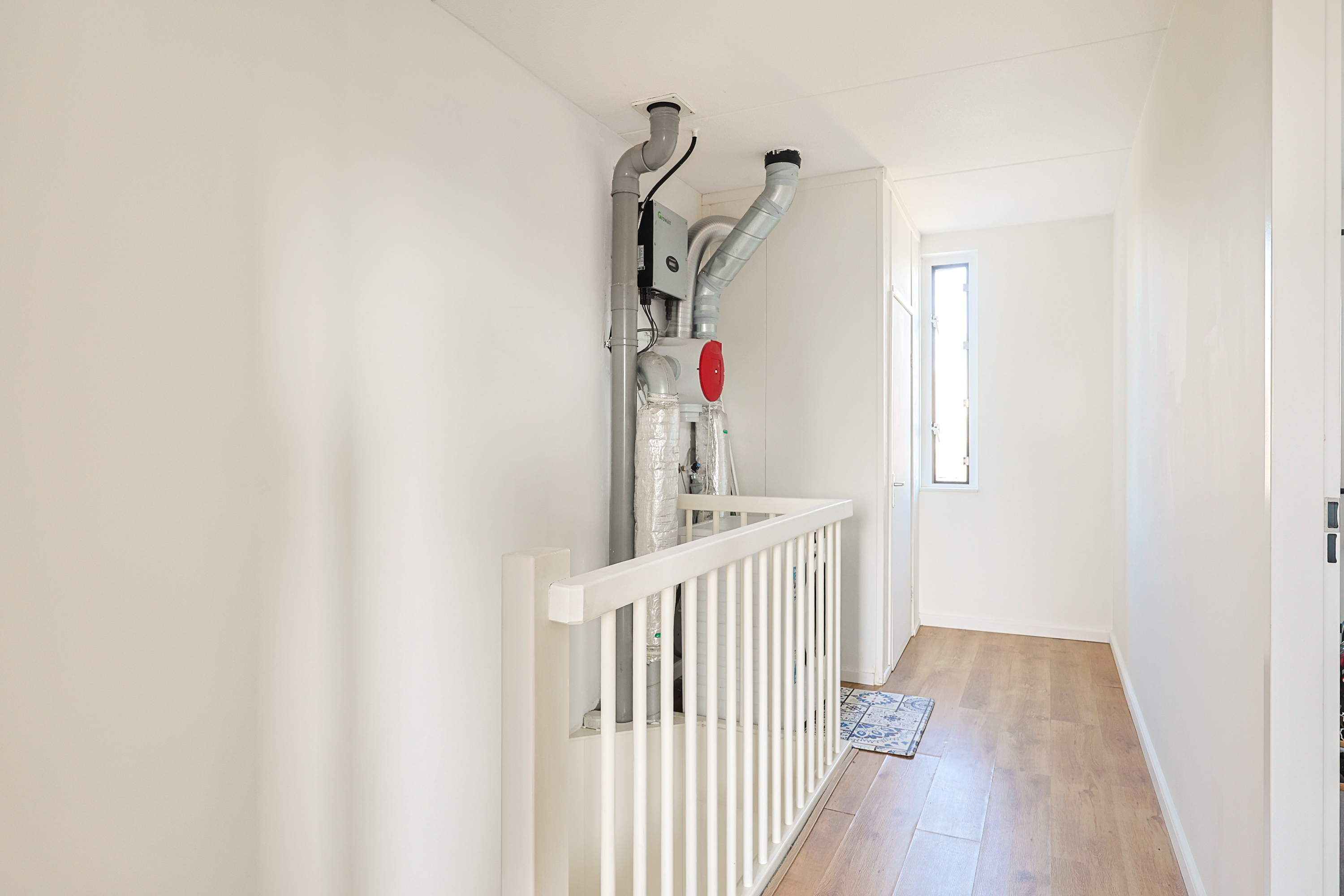Overloop met opstelplaats voor wasmachine en droger en toegang tot twee ruime slaapkamers. Dankzij de rechte gevels is deze verdieping optimaal benut en verrassend ruim.