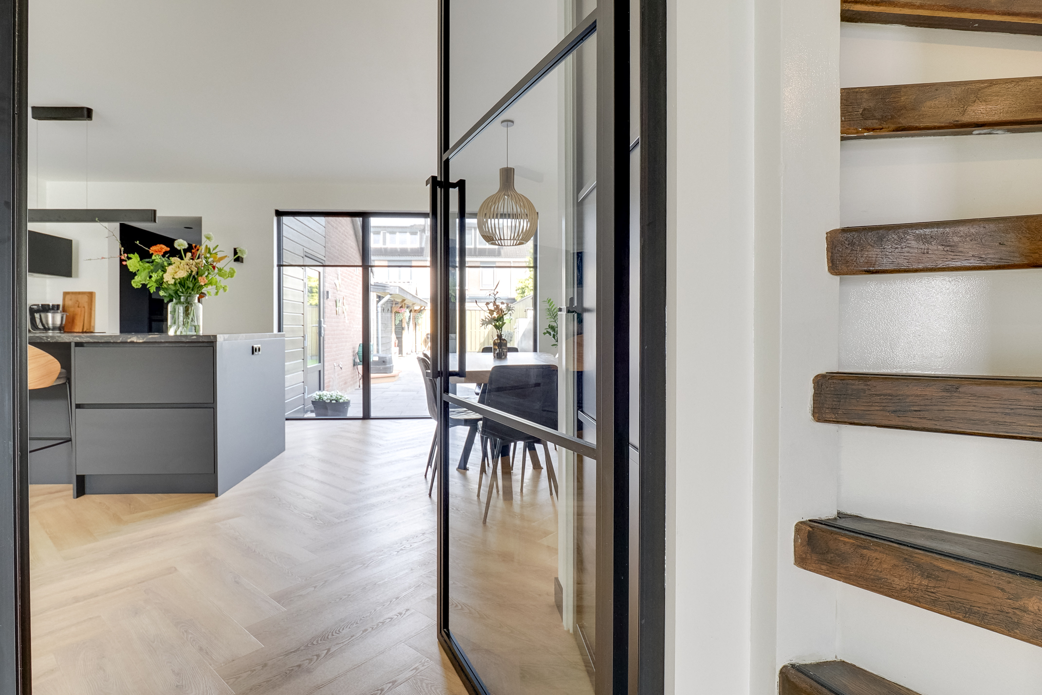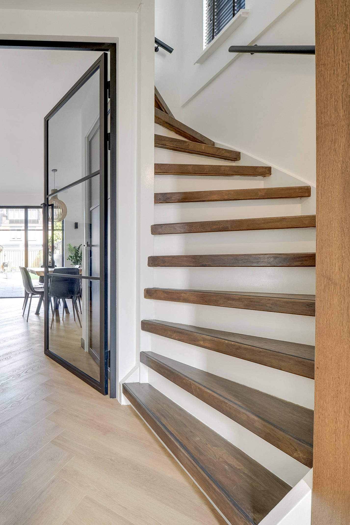 Bij binnenkomst ervaar je direct de luxe afwerking. De begane grond is voorzien van vloerverwarming met vloerisolatie en een stijlvolle visgraat PVC-vloer. De massief eiken trappen met oriëntatieverlichting geven een exclusieve uitstraling.