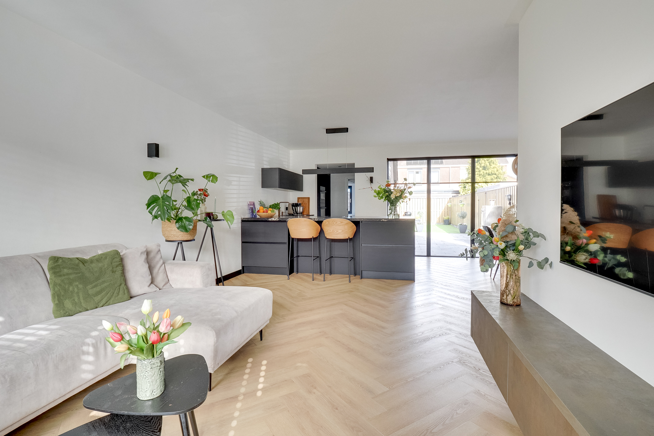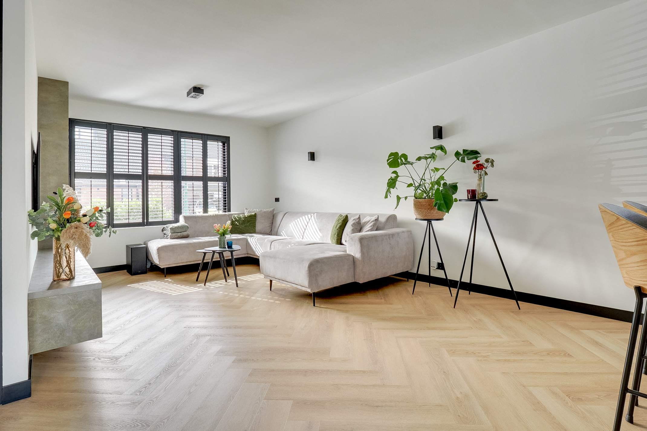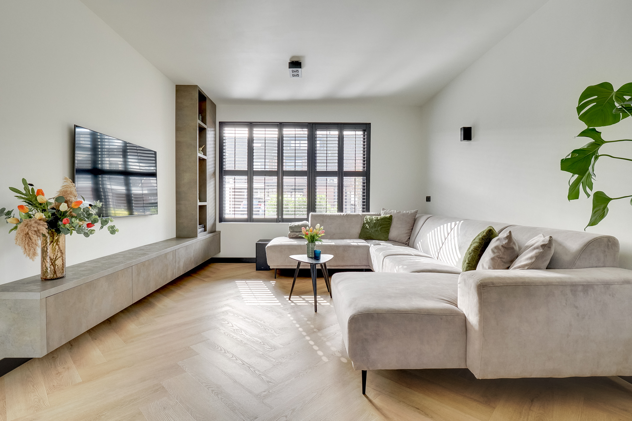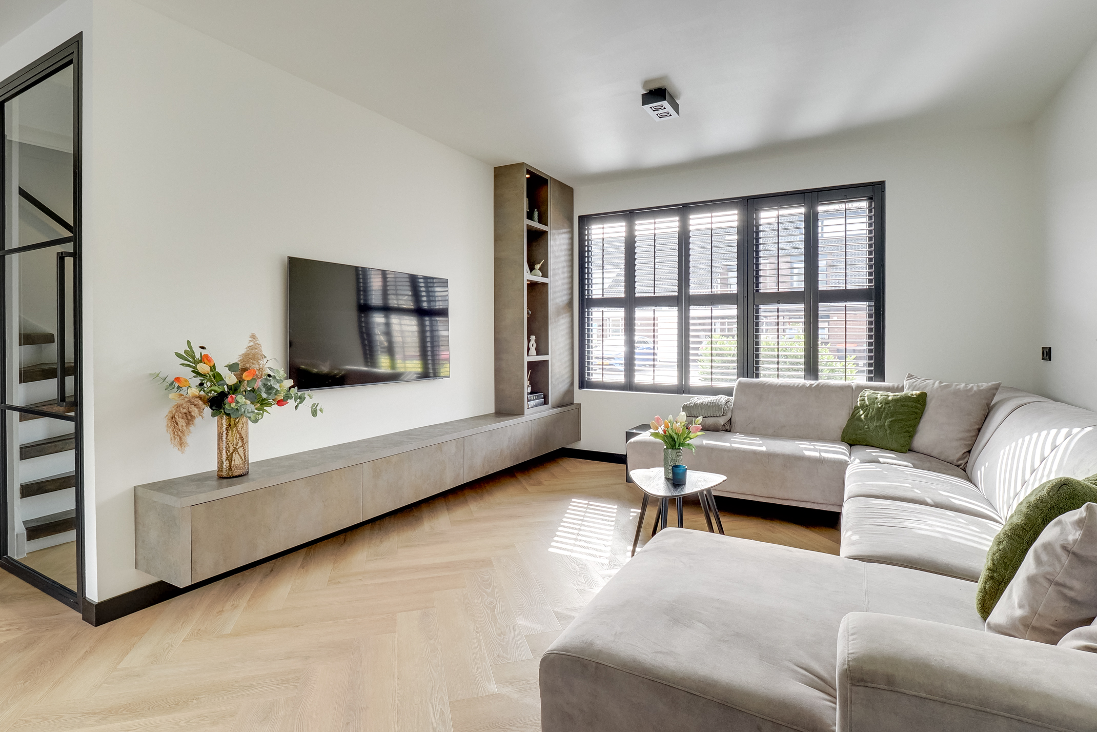 De woonkamer beschikt over een op maat gemaakte cinewall met push-to-open-systeem en geïntegreerde verlichting. Elektrische rolgordijnen (via app en afstandsbediening) en shutters zorgen voor extra comfort en sfeer.