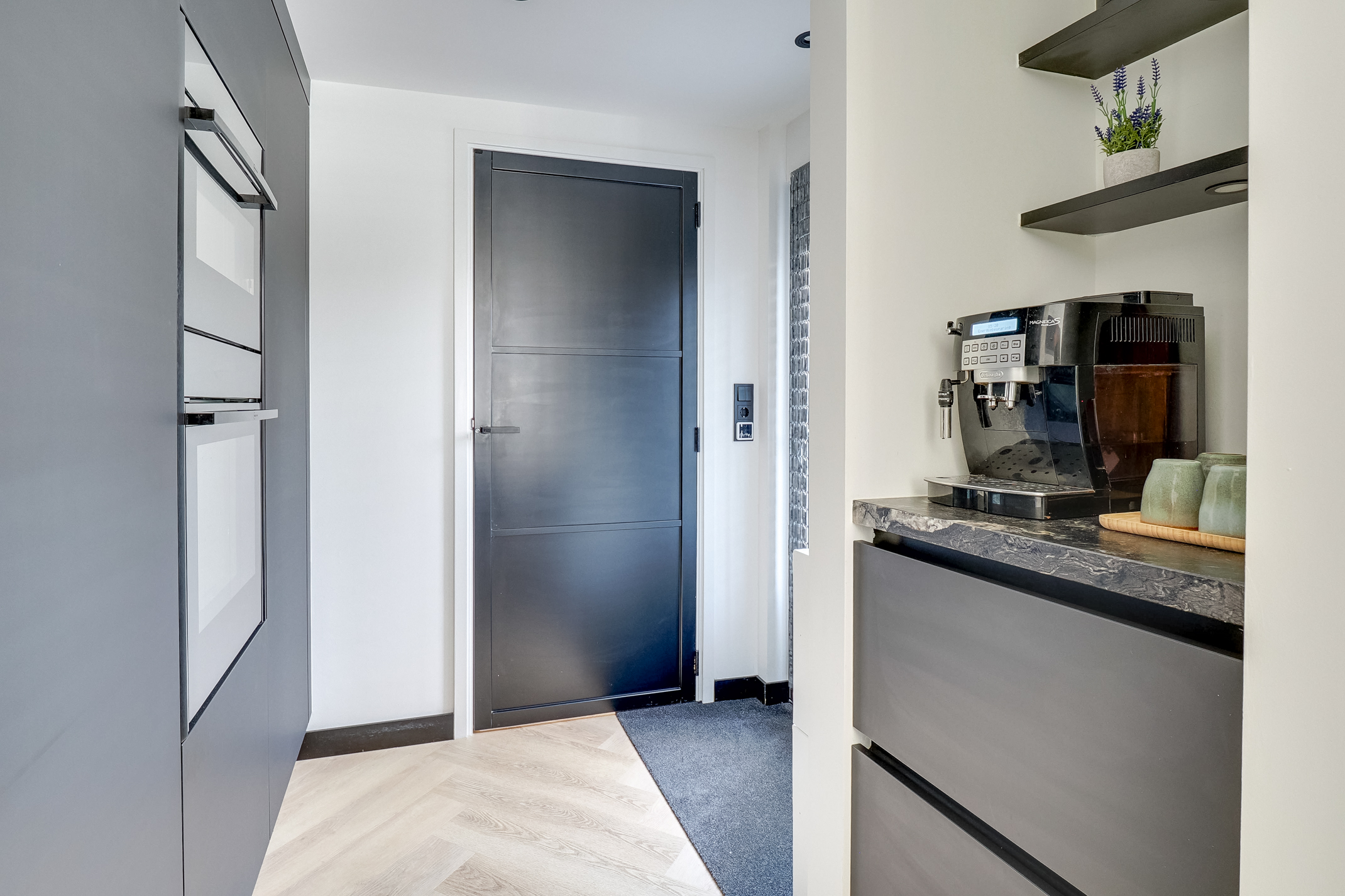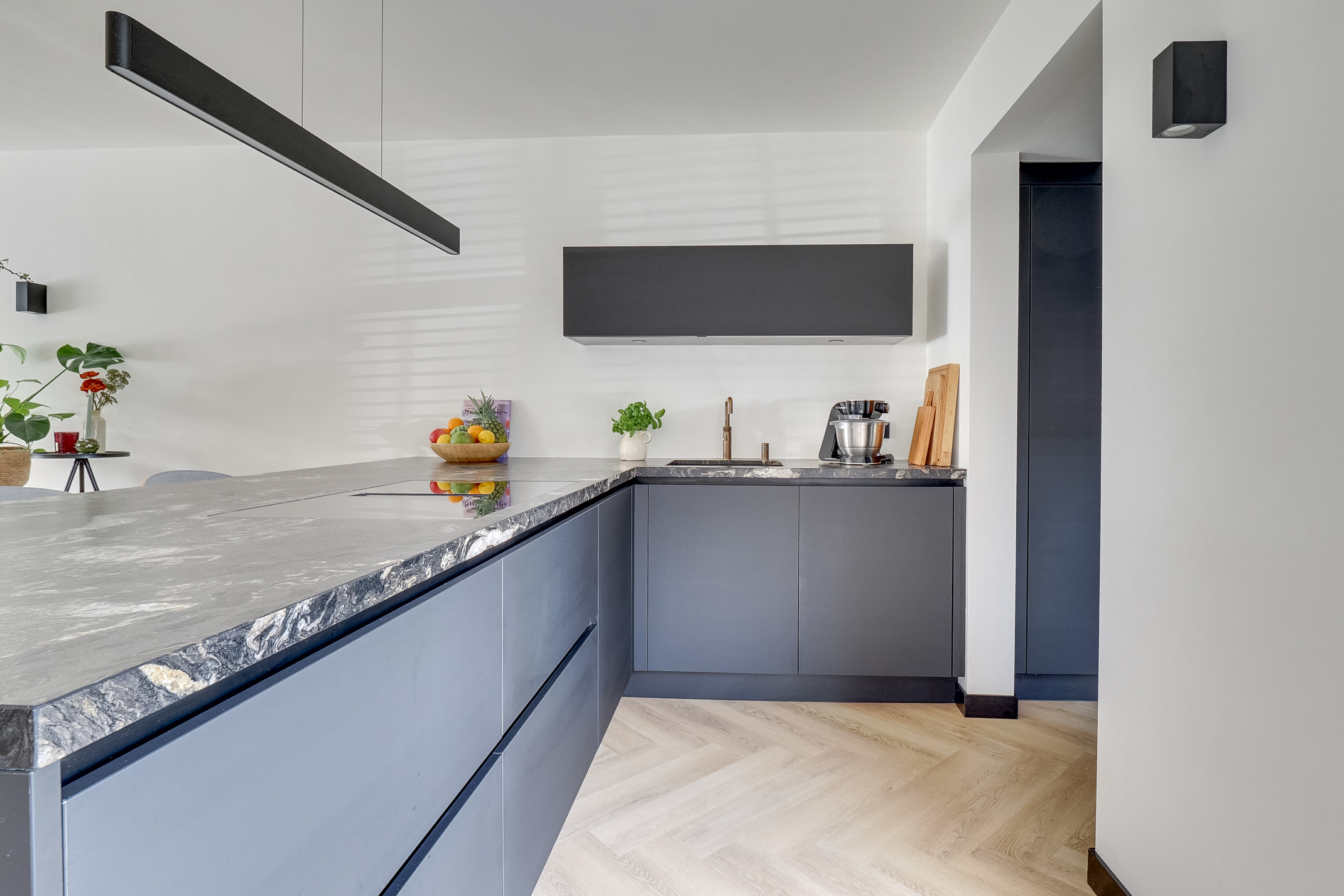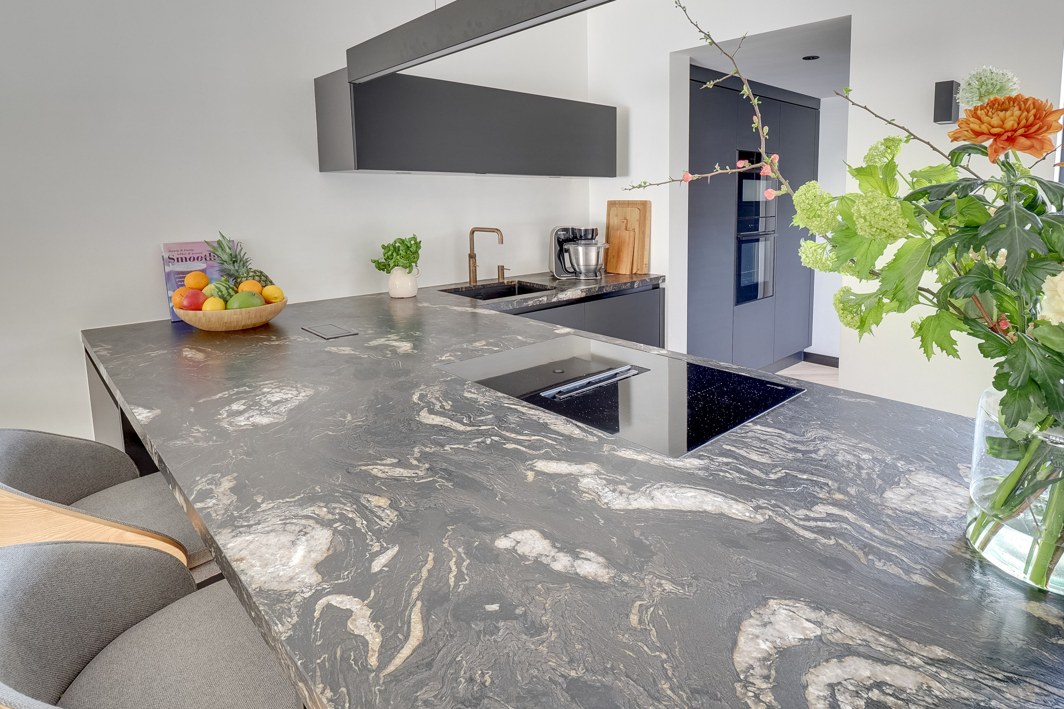 De moderne eilandkeuken (2024) is een echte eyecatcher en van alle gemakken voorzien. Denk aan hoogwaardige Neff-apparatuur, twee ovens, een slimme kookplaat, kokendwaterkraan en een stijlvolle koffiecorner. Het geborsteld granieten blad en de greeploze afwerking maken het geheel compleet.