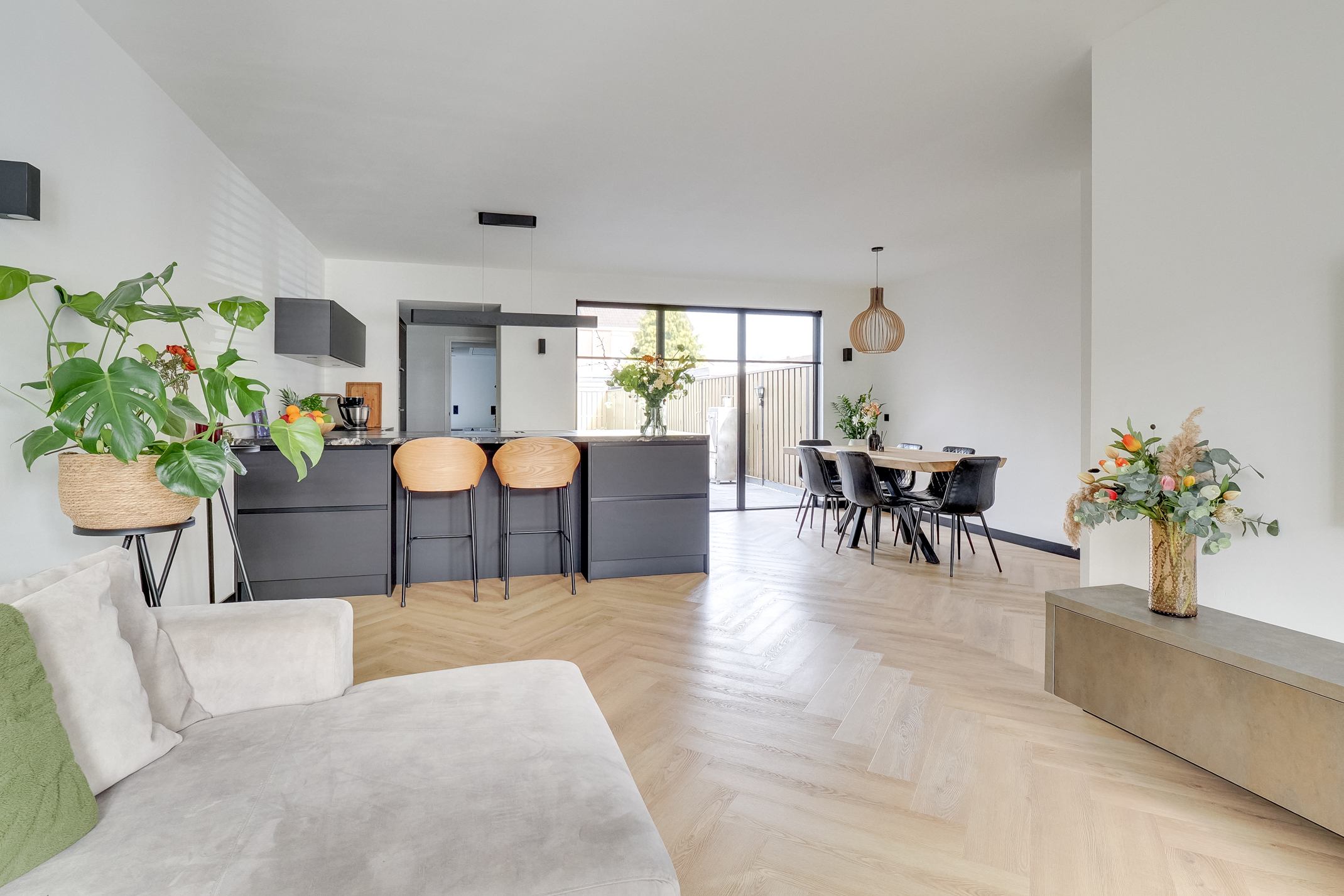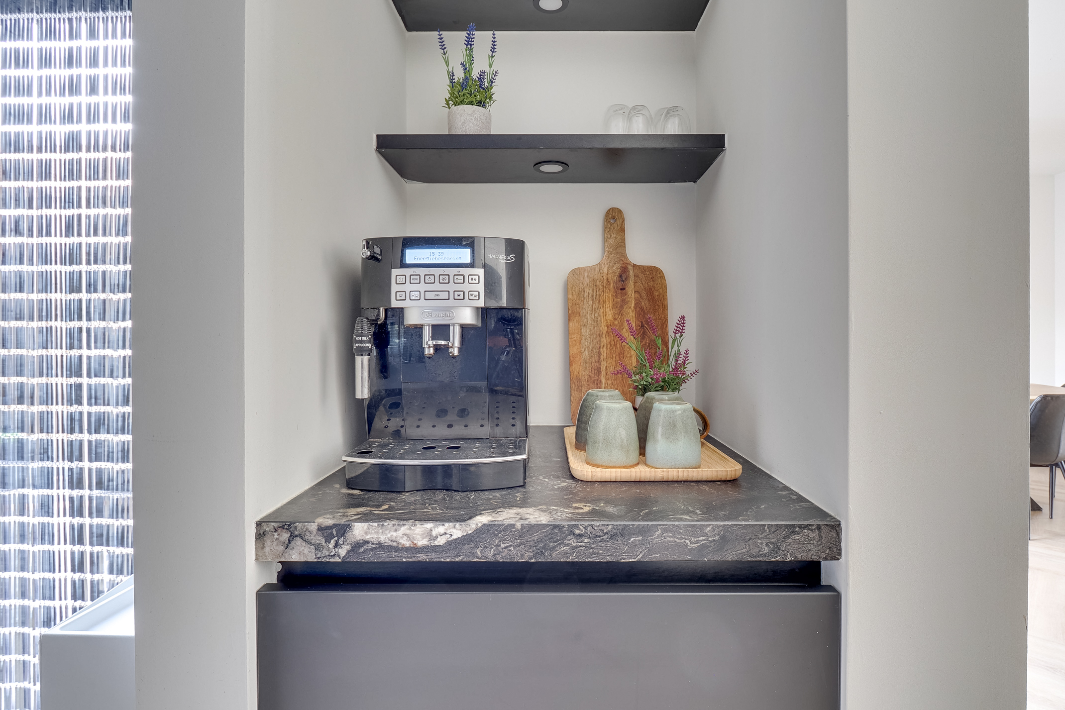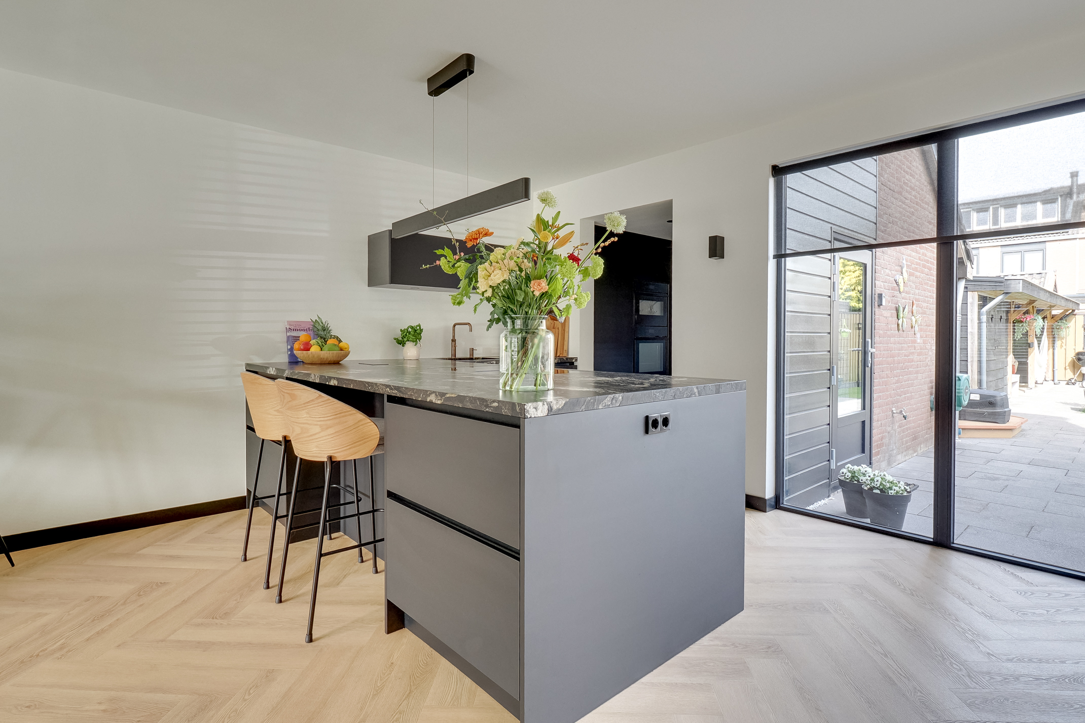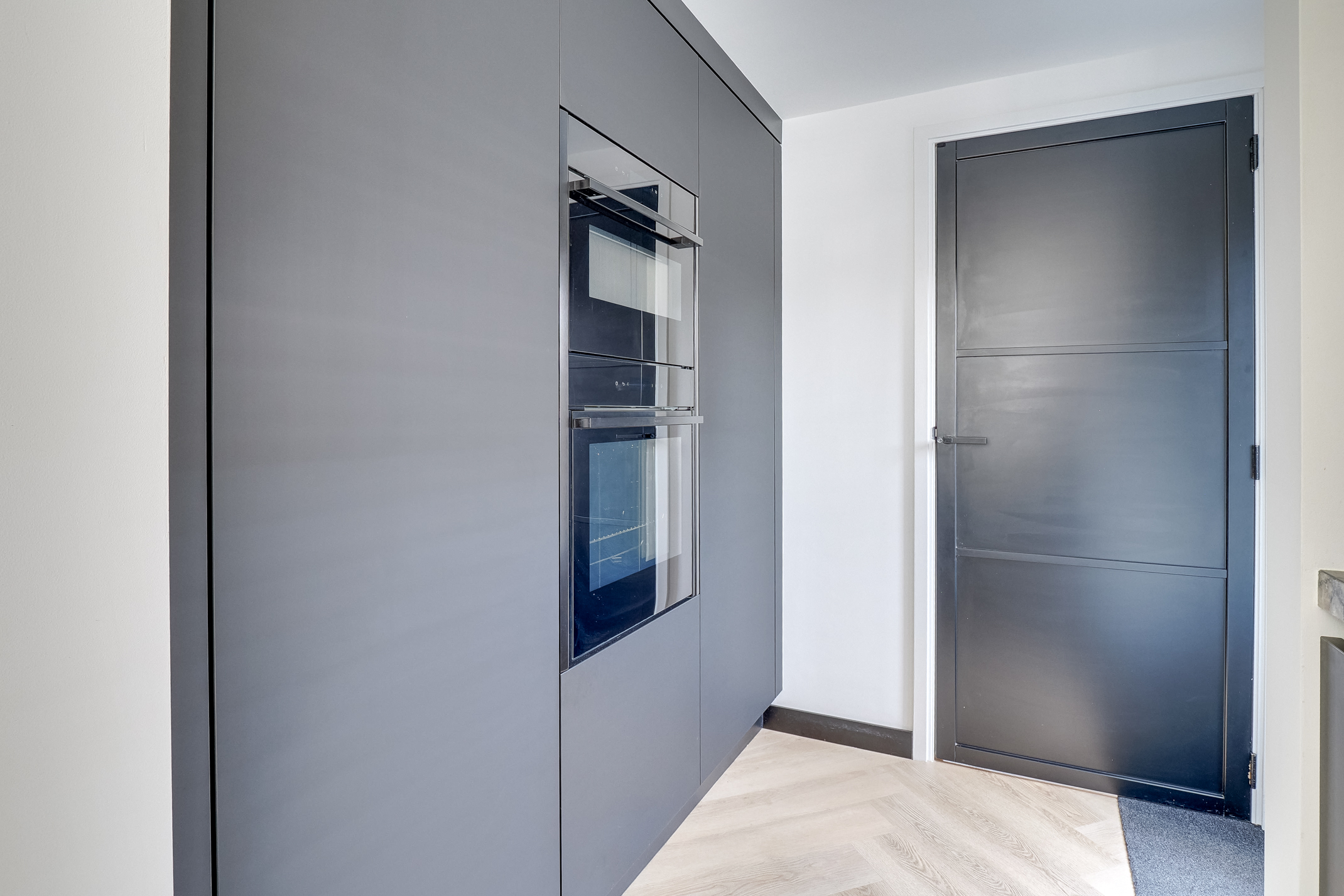 De moderne eilandkeuken (2024) is een echte eyecatcher en van alle gemakken voorzien. Denk aan hoogwaardige Neff-apparatuur, twee ovens, een slimme kookplaat, kokendwaterkraan en een stijlvolle koffiecorner. Het geborsteld granieten blad en de greeploze afwerking maken het geheel compleet.