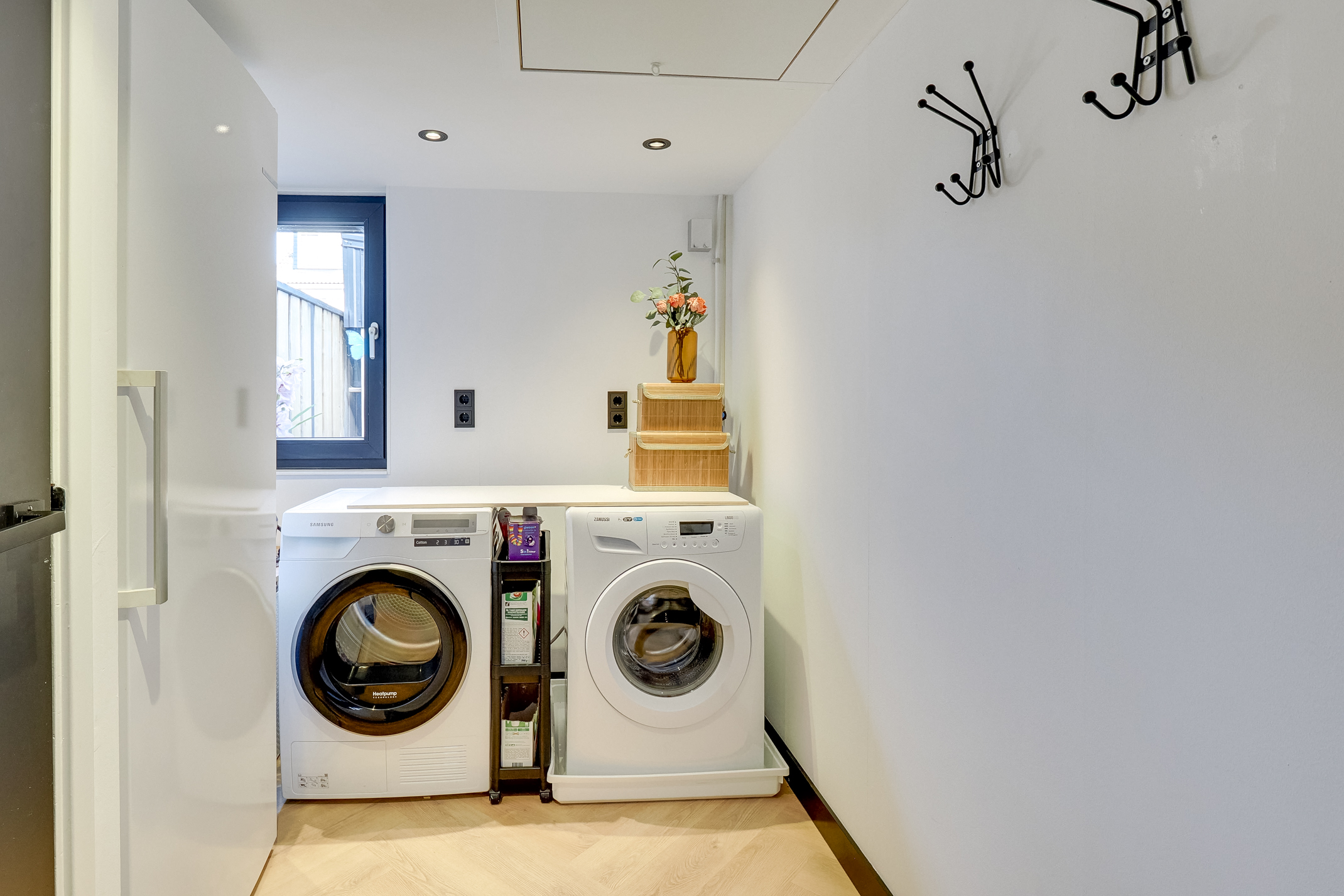 De geïsoleerde wasruimte beschikt over vloerverwarming, een opbergkast en een praktische opbergzolder.