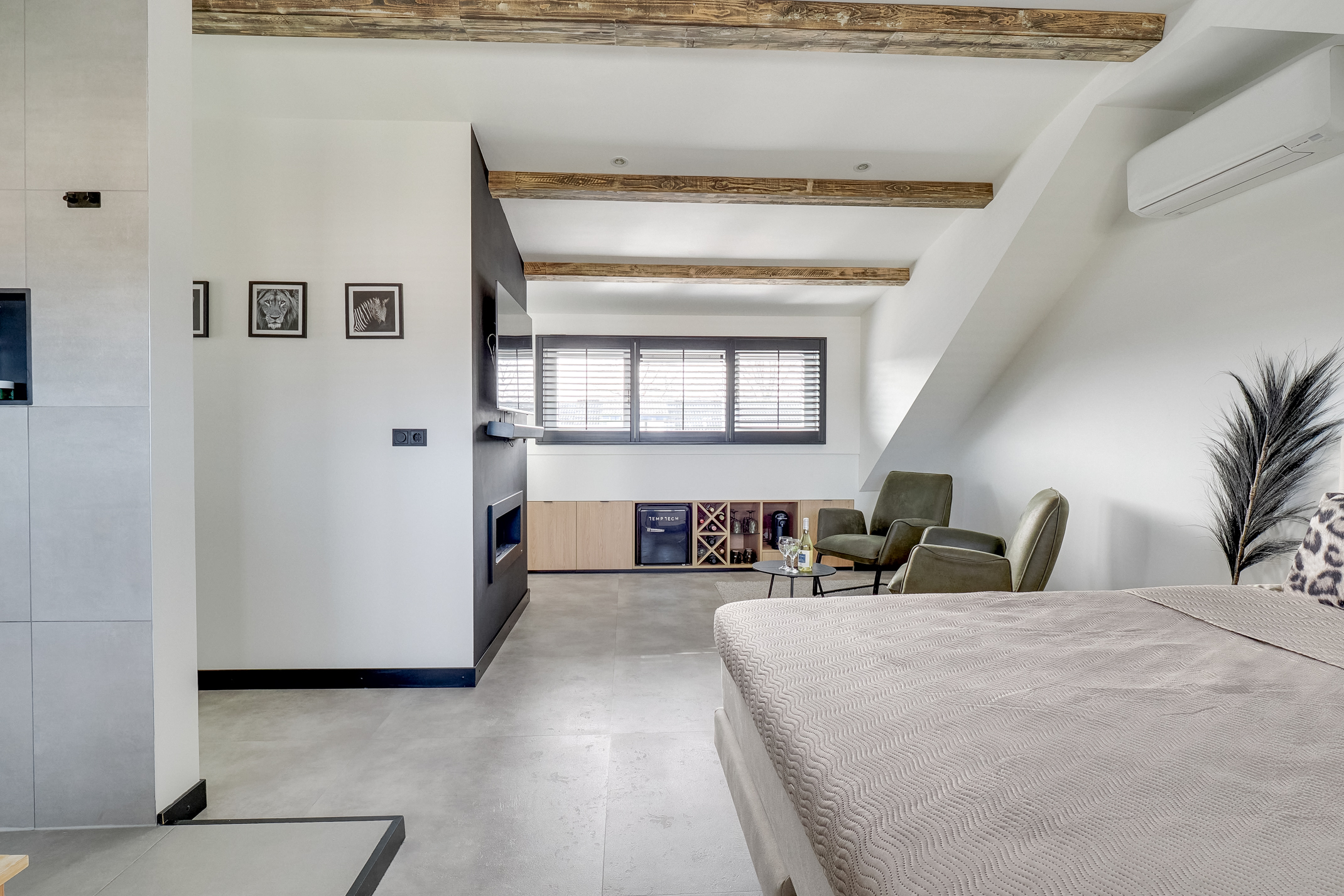- Volledig vernieuwde luxe ensuite verdieping (2024) met open badkamer, inloopkast, kantoorruimte, airconditioning en zitgedeelte met sfeerhaard en minibar