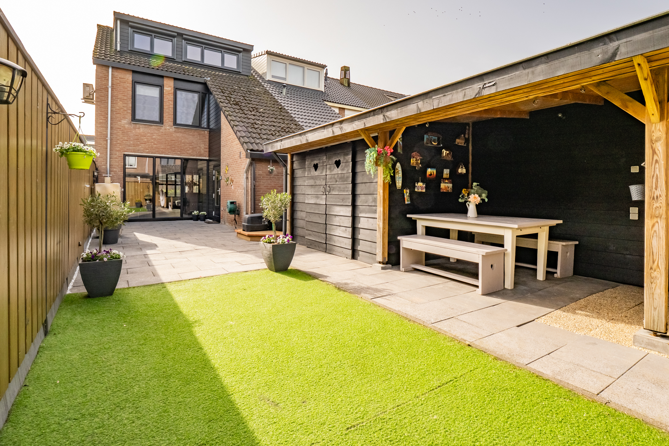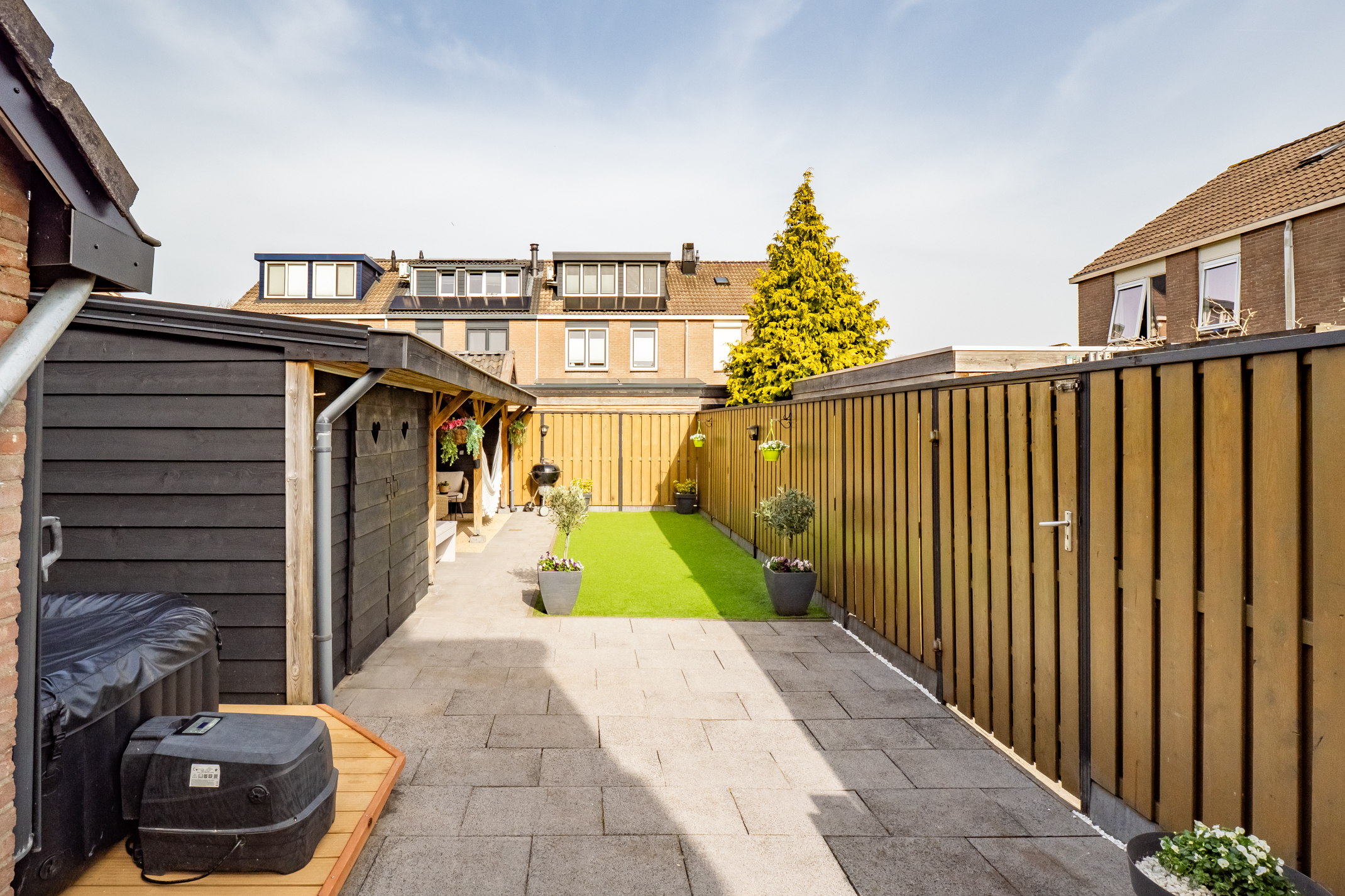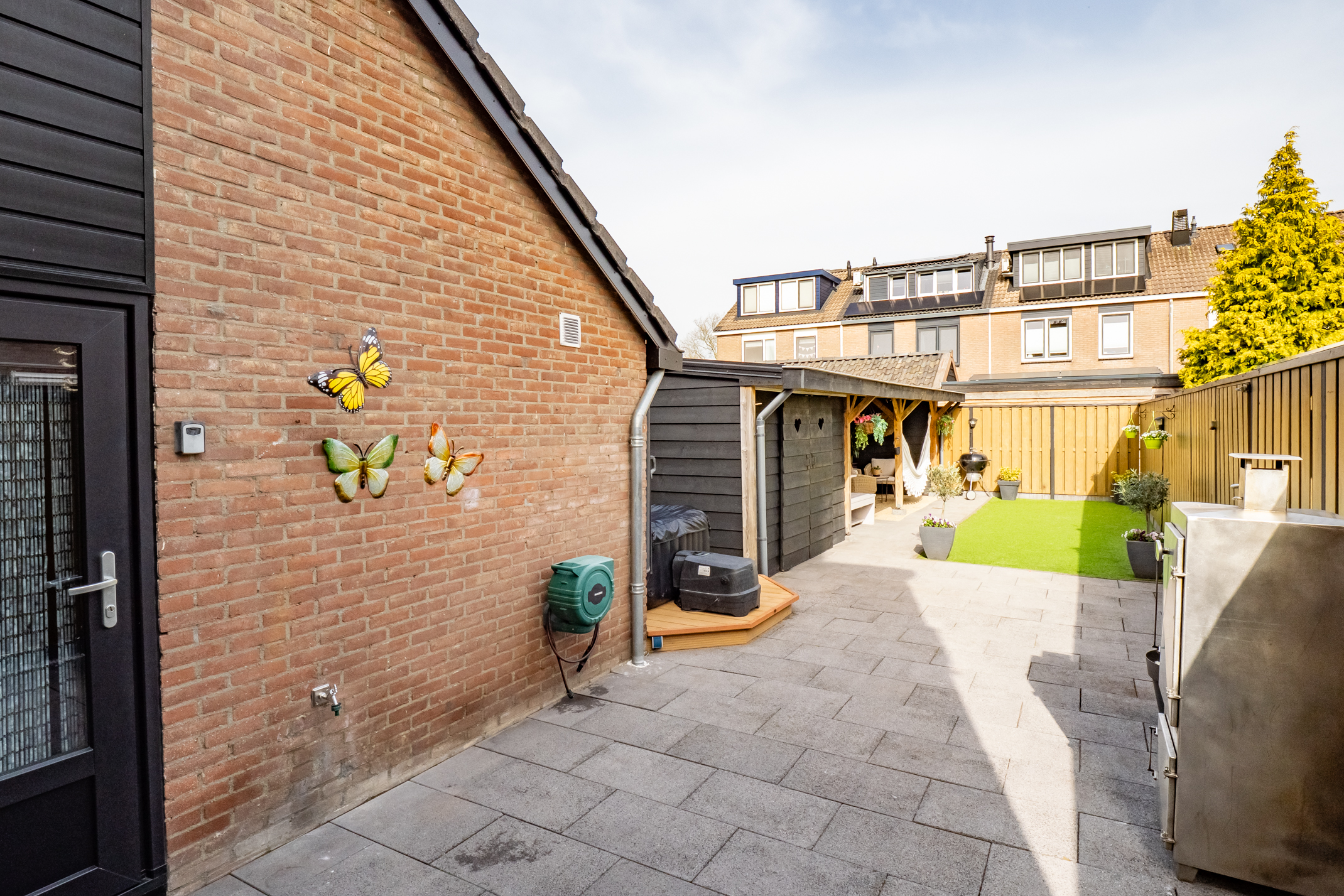 De tuin is verzorgd aangelegd en biedt volop mogelijkheden om te ontspannen. De composiet vlonder is geschikt voor een spa of jacuzzi en onder de veranda geniet je het hele jaar door van het buitenleven. De berging met aparte werk-/bakruimte en elektra is ideaal voor hobby’s. De automatische tuinverlichting zorgt voor extra gemak en sfeer.