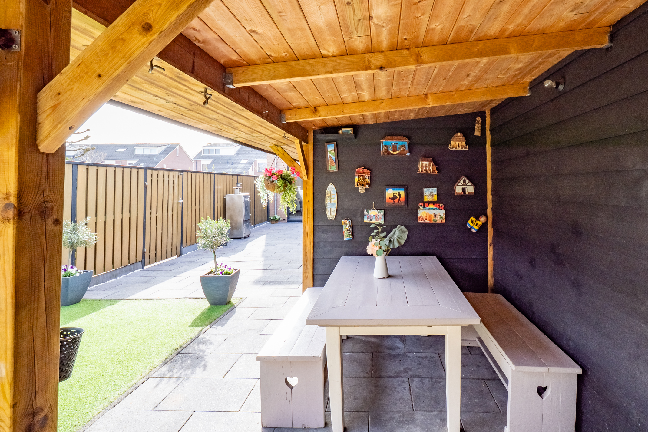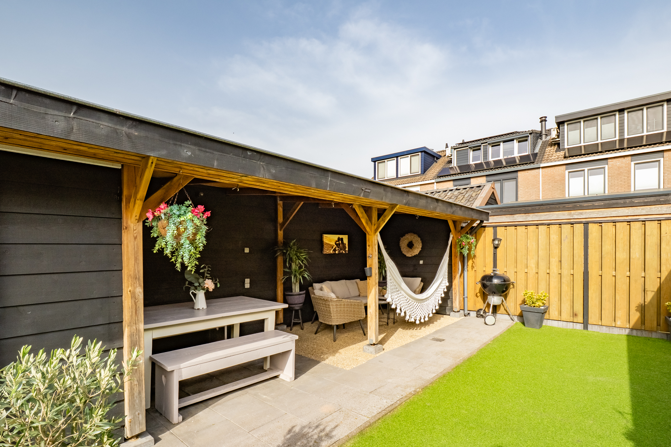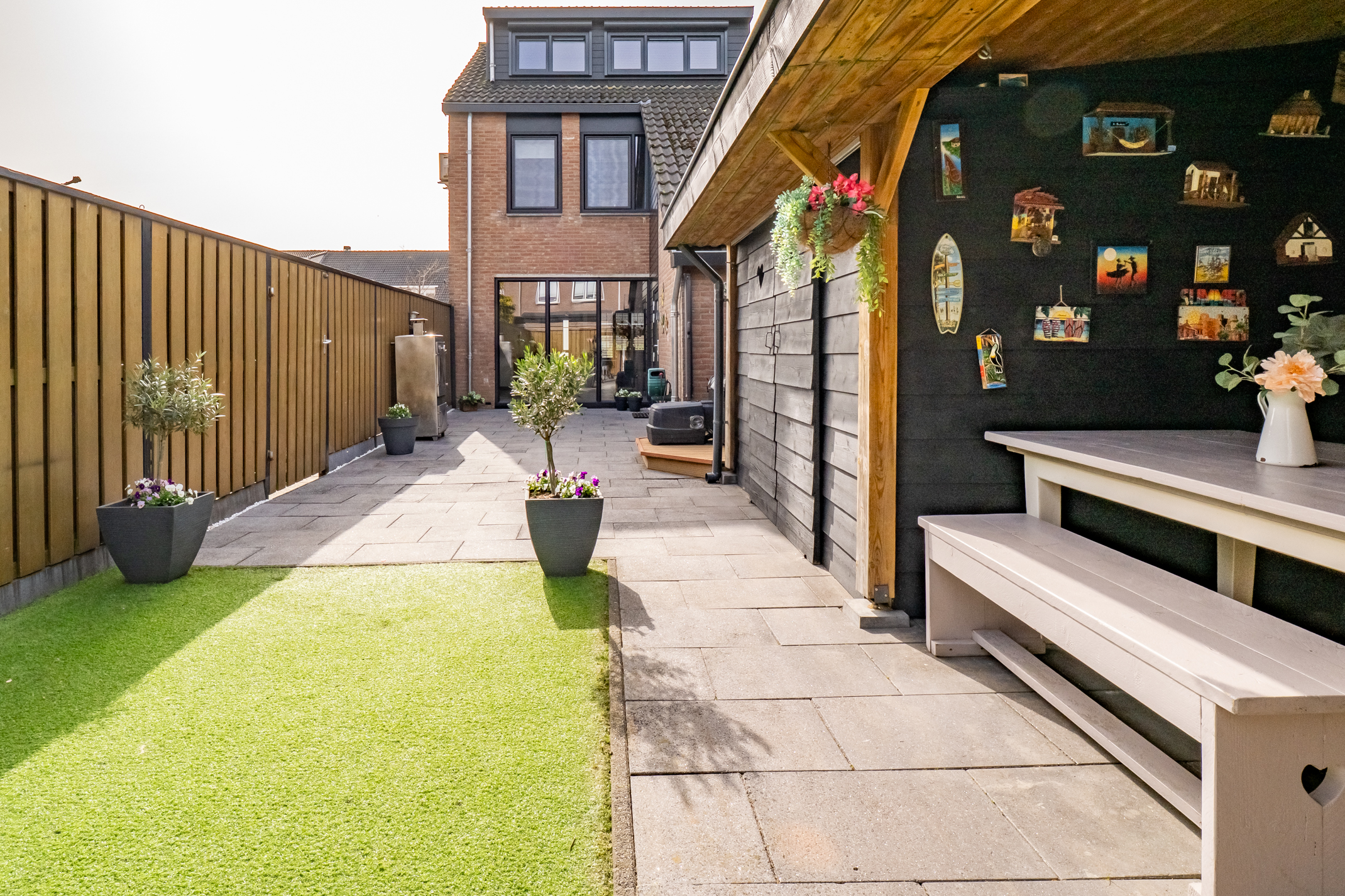 De tuin is verzorgd aangelegd en biedt volop mogelijkheden om te ontspannen. De composiet vlonder is geschikt voor een spa of jacuzzi en onder de veranda geniet je het hele jaar door van het buitenleven. De berging met aparte werk-/bakruimte en elektra is ideaal voor hobby’s. De automatische tuinverlichting zorgt voor extra gemak en sfeer.